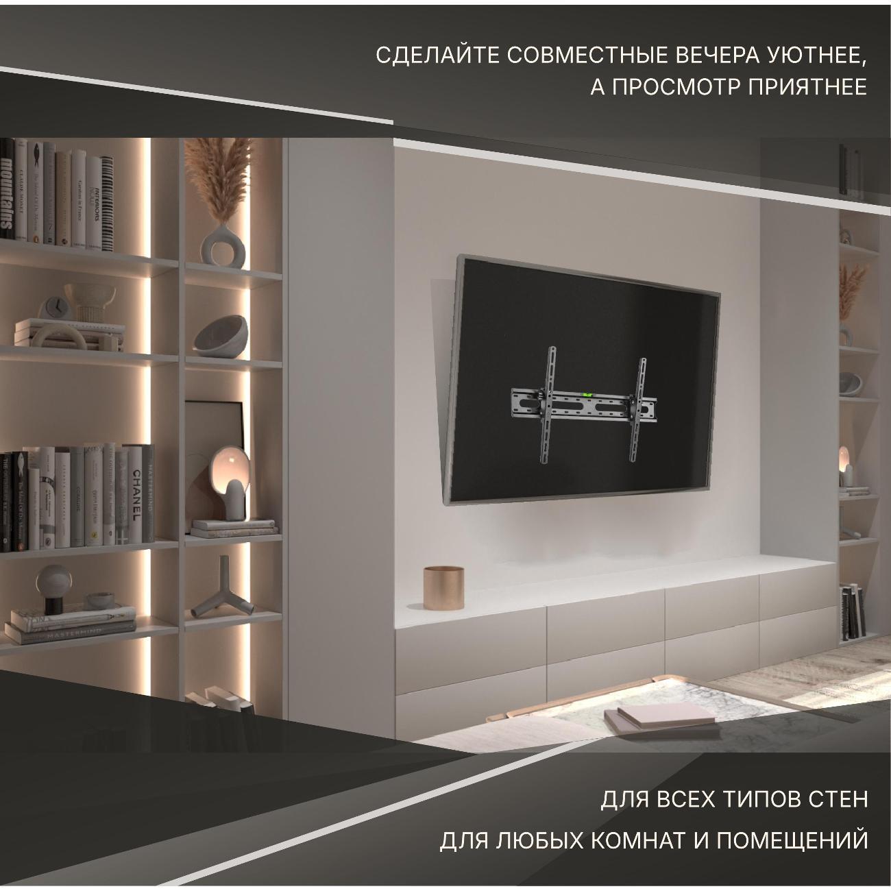 Установка быстрая и простая: полный комплект винтов и шурупов подошёл идеально к моему 55-дюймовому ТВ, металл толстый, тяжёлый, без намёка на прогиб даже при нагрузке. Держит экран мёртвой хваткой, наклон и поворот регулируются плавно — смотреть с дивана или с кухни одно удовольствие.