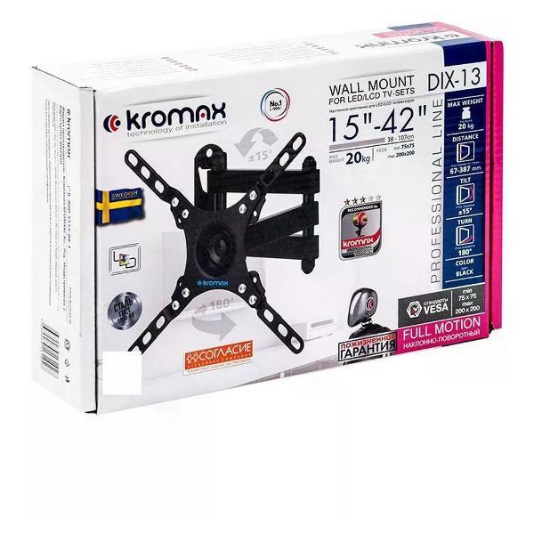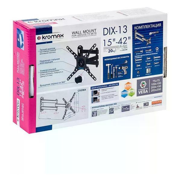 Вы можете купить Кронштейн для телевизора Kromax DIX-13 в магазинах М.Видео по доступной цене. Кронштейн для телевизора Kromax DIX-13: подробное описание, фото и отзывы реальных покупателей, характеристики, возможность скачать инструкции и подобрать аксессуары.
