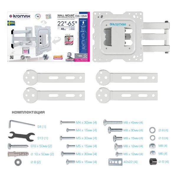 Вы можете купить Кронштейн для телевизора Kromax DIX-18w в магазинах М.Видео по доступной цене. Кронштейн для телевизора Kromax DIX-18w: подробное описание, фото и отзывы реальных покупателей, характеристики, возможность скачать инструкции и подобрать аксессуары.