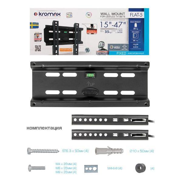 Вы можете купить Кронштейн для телевизора Kromax FLAT-5 в магазинах М.Видео по доступной цене. Кронштейн для телевизора Kromax FLAT-5: подробное описание, фото и отзывы реальных покупателей, характеристики, возможность скачать инструкции и подобрать аксессуары.