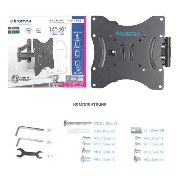 Вы можете купить Кронштейн для телевизора Kromax TECHNO-3 в магазинах М.Видео по доступной цене. Кронштейн для телевизора Kromax TECHNO-3: подробное описание, фото и отзывы реальных покупателей, характеристики, возможность скачать инструкции и подобрать аксессуары.