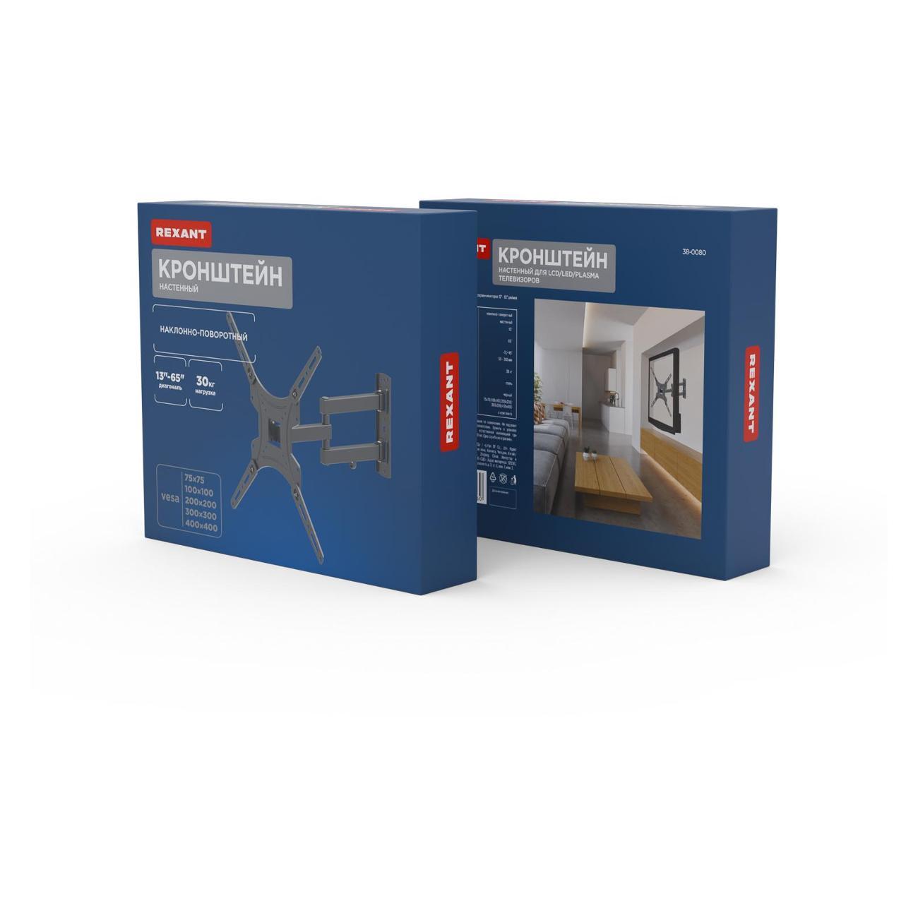 Кронштейн для ТВ наклонно-поворотный Rexant 38-0080 рассчитан на монтаж панелей с расширенной сеткой крепежных точек и оснащен механизмами корректировки положения экрана в нескольких плоскостях.