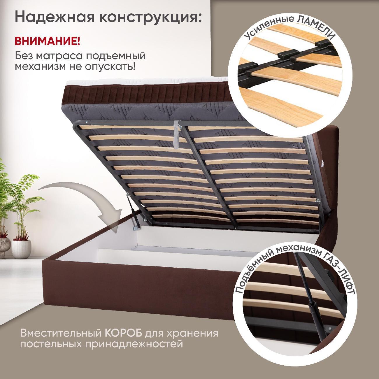 Двуспальная кровать 160x200 с мягким изголовьем идеально подходит для взрослой спальни и обеспечивает комфортный сон. Основание выполнено из ламелей, что гарантирует ортопедическую поддержку и амортизацию. Каркас изготовлен из ЛДСП — прочного материала, придающего надежность конструкции без ножек. Подъемный механизм позволяет легко поднимать основание кровати, где расположены вместительные ящики для хранения вещей. Максимальная нагрузка на мебель составляет 200 кг, делая ее устойчивой и безопасной в использовании для людей разной комплекции.