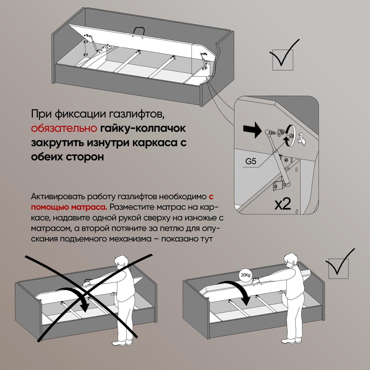 ВНИМАНИЕ! НЕЛЬЗЯ опускать подъемный механизм без матраса! Он не опустится и это не брак амортизаторов.