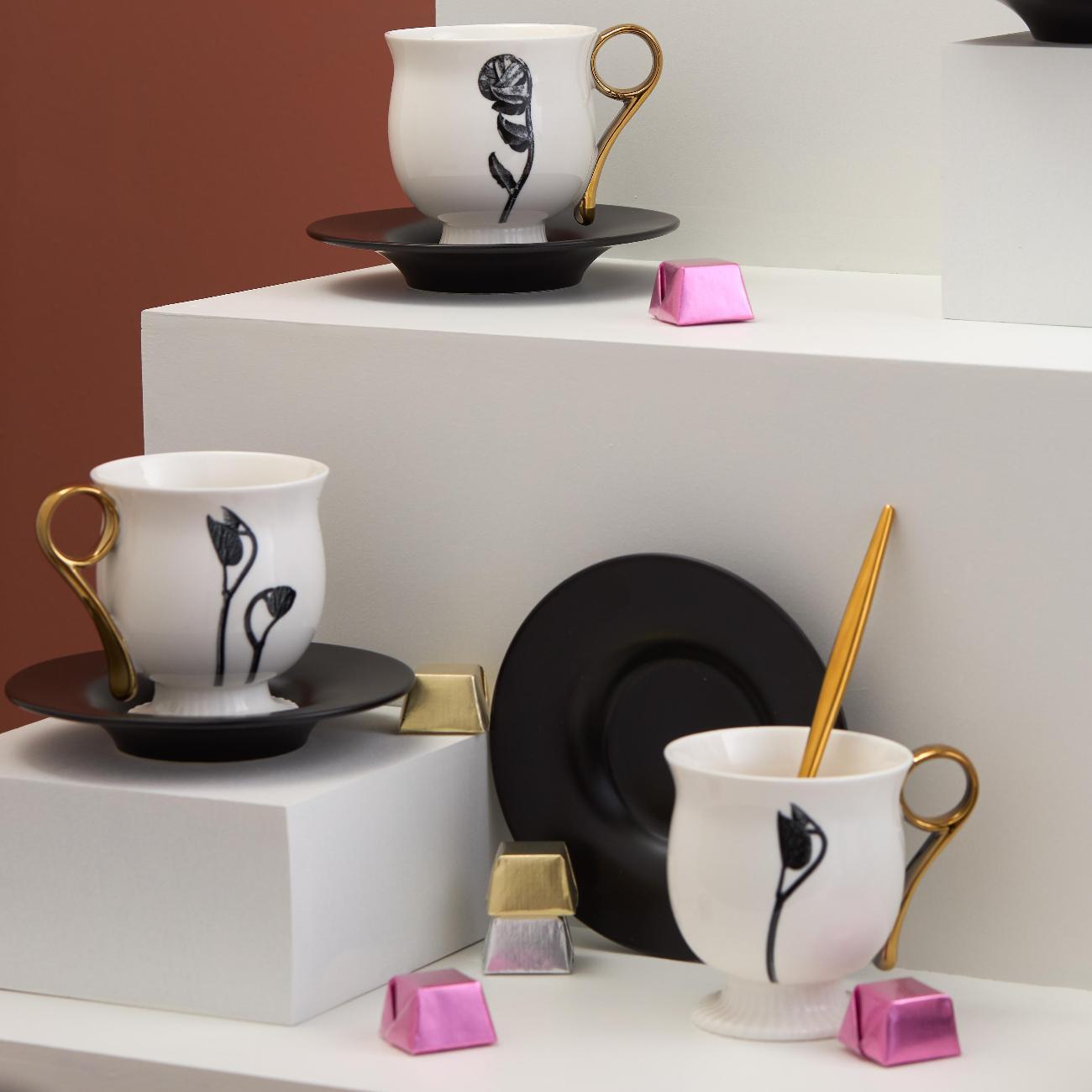 - Белоснежная чашка в сочетании с черным блюдцем создают эффектный контраст, акцентируя внимание на стильной сервировке.