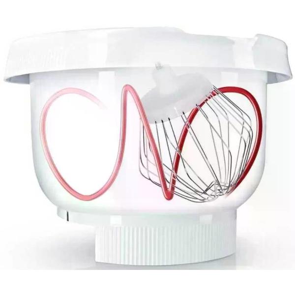 Изделие не скользит по столешнице благодаря ножкам с прорезиненной поверхностью. Функция планетарного движения насадок позволяет быстро замесить тесто. Световые индикаторы показывают параметры функционирования. Кожух защищает двигатель от попадания брызг. Размер — 26,5х30,5х26,5 см, вес — 3,5 кг.