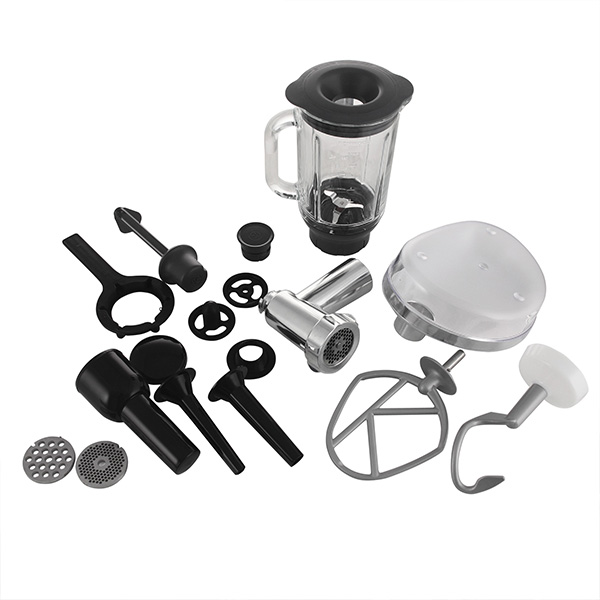 В комплект входят мясорубка, блендер с функцией колки льда и насадки для взбивания и замешивания теста. Это значительно расширяет возможности кухонной машины. Все аксессуары можно мыть в посудомоечной машине.