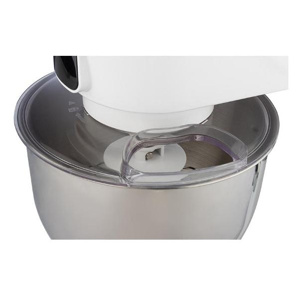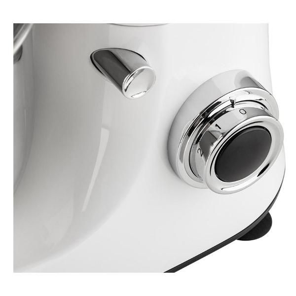 Модель оснащена чашей объемом 4,8 л, изготовленной из стали, устойчивой к ржавчине, погружная часть — металл. Предусмотрена защитная крышка с отверстиями для предотвращения вылета брызг. Кувшин блендера объемом 1,5 л выполнен из стекла и комплектуется герметичной крышкой. Планетарное вращение насадок обеспечивает выполнение большого количества операций, среди них — замешивание теста.