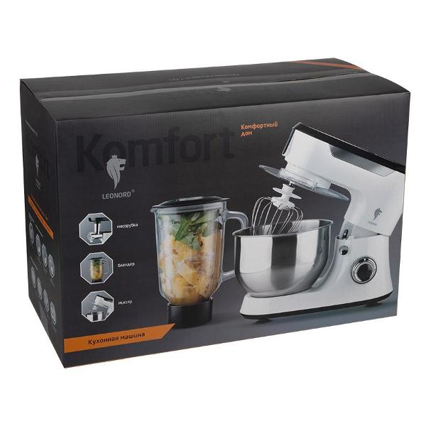 Кухонная машина Leonord LE-1721, белая заменяет три прибора: планетарный миксер, блендер, мясорубку. Питается от электросети посредством кабеля длиной 1,5 м. Потребляемая мощность мотора составляет 1000 Вт. При перегреве в целях безопасности срабатывает система автоматического отключения.