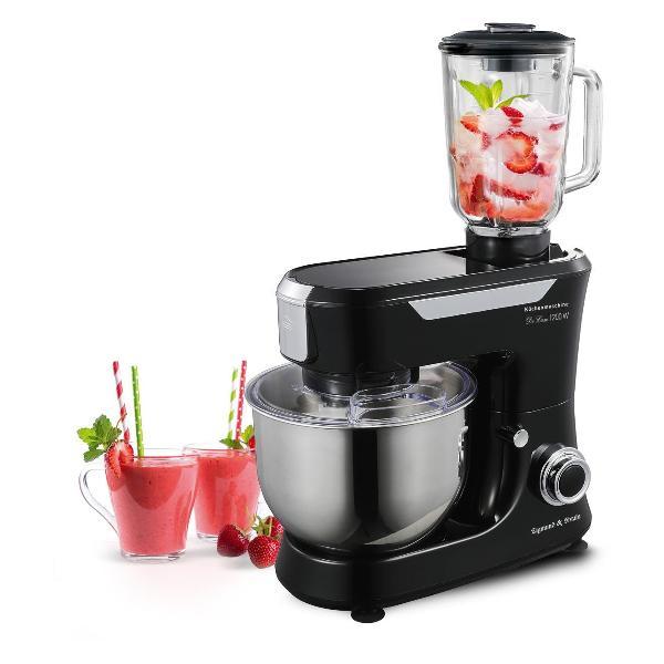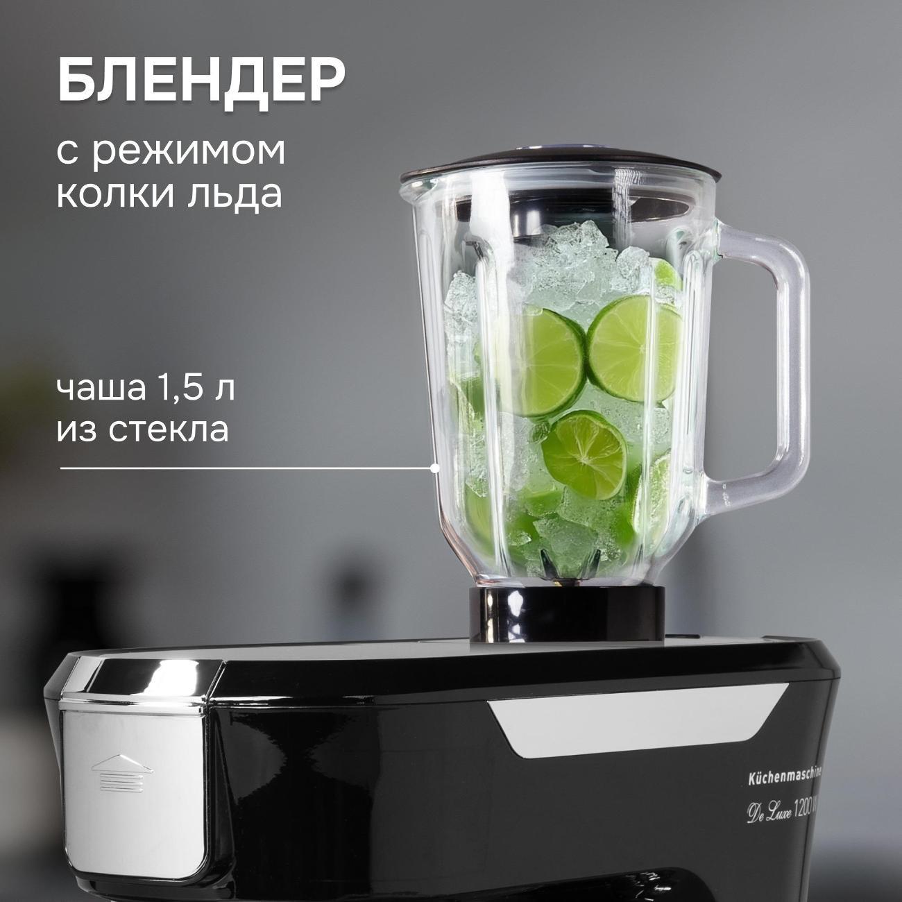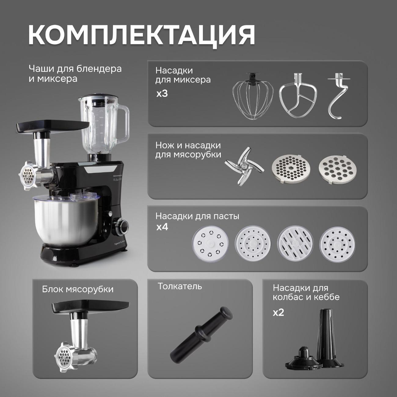 Функция планетарного движения насадок ускоряет процесс замешивания теста. При перегреве предусмотрено отключение, что повышает безопасность применения. В наборе поставляется 12 насадок, нож, чаши объемом 1,5 л и 5 л, книга рецептов, толкатель, лопаточка. Изделие можно использовать в качестве миксера, мясорубки, блендера, изготовителя пасты.