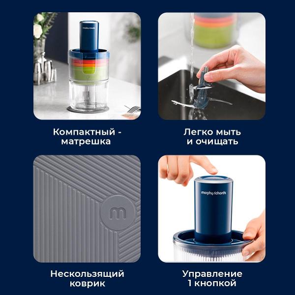 Кухонный комбайн Morphy Richards MR9405 — это устройство с механическим управлением и одной скоростью. В комплекте поставляются две насадки для измельчения продуктов. Корпус выполнен из пластика. Объем кувшина — 1 л.