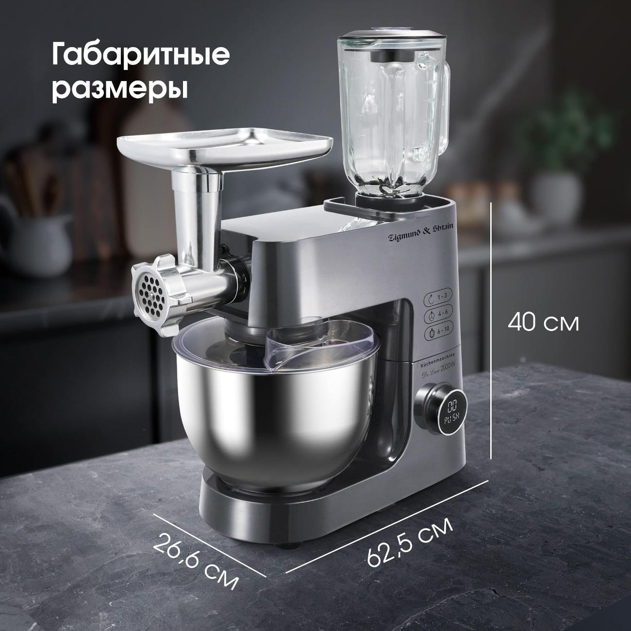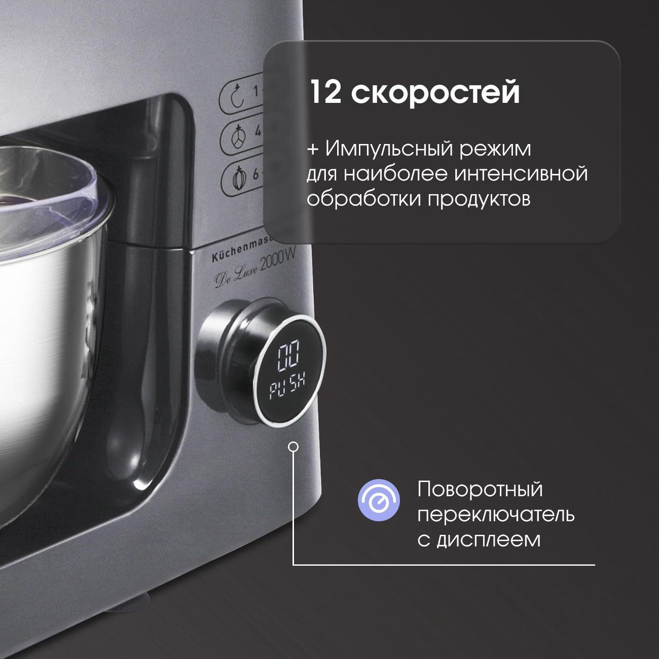 Потребляемая мощность составляет 2000 Вт. Объем металлической чаши — 7 л. В комплект входят десять насадок, в том числе крюк для замеса теста, венчик для взбивания и другие аксессуары.