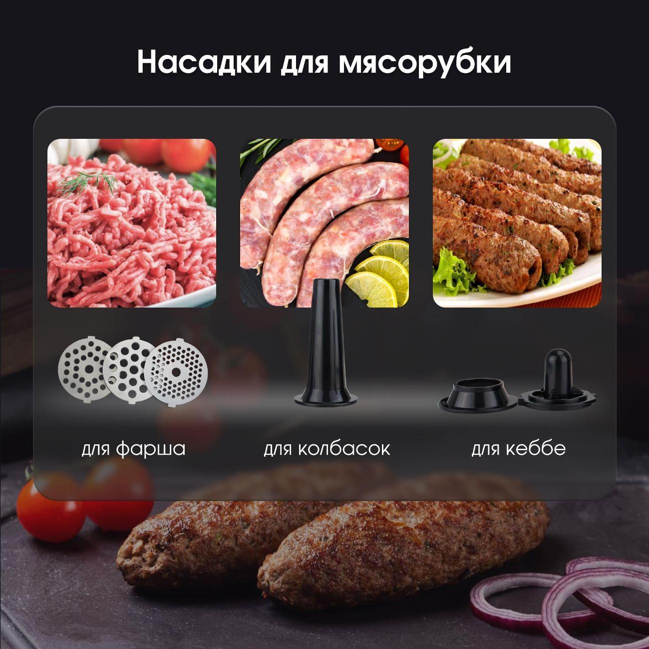 Комбайн укомплектован мясорубкой и чашей-блендером из закаленного стекла.