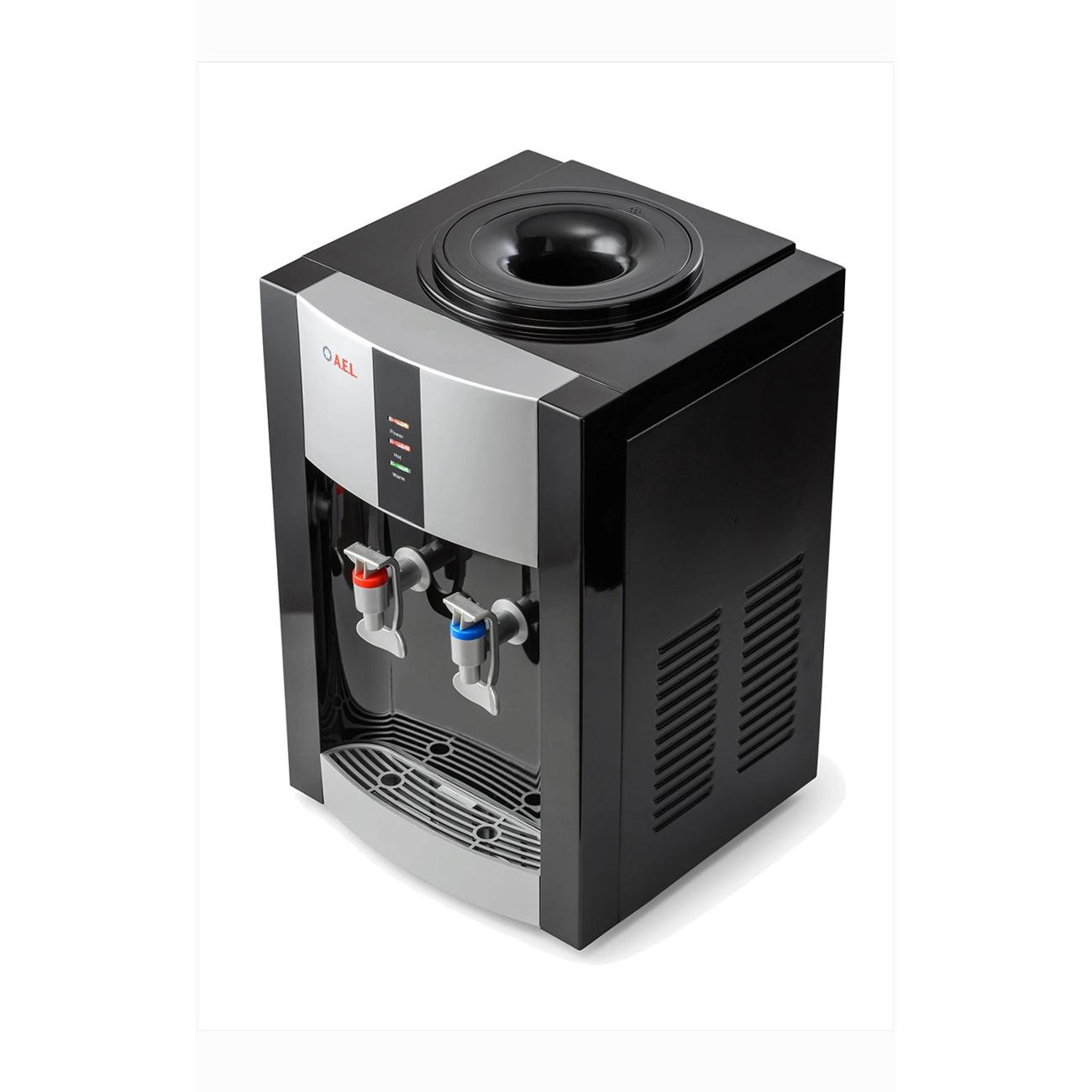 Кулер AEL черный TD-AEL-47 с настольным размещением отличается компактным размером 52х33,5х34,5 см и небольшим весом, равным 4,9 кг. Для подачи воды задействуются электрическая помпа и краники с нажимными механизмами. Съемный поддон для сбора капель делает пользование удобным. Бутыль размещается сверху. Устройство оборудовано высокопрочными и износостойкими баками из пластика. Охлаждение электронного типа мощностью 75 Вт с производительностью 0,7 л/час обеспечивает температуру 15°C. Спиралевидный нагревательный элемент работает с показателями 550 Вт и 5 л/час, доводя жидкость до 90°C.