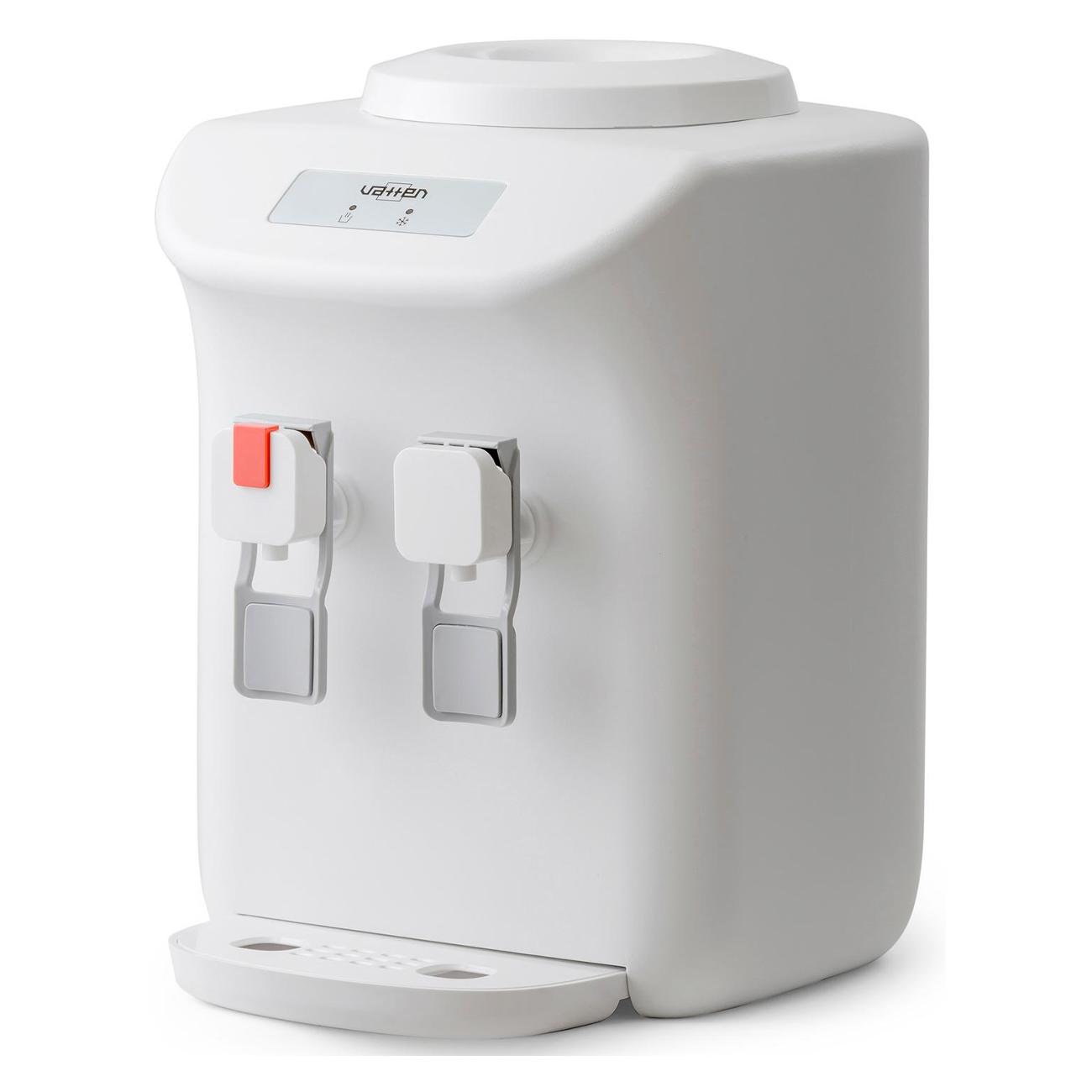 Кулер Vatten D27WF белого цвета — это компактная модель, которая подходит для домашнего использования или размещения в небольшом офисе. Аппарат подает воду двух типов — горячую и комнатную. Чтобы набрать жидкость, достаточно нажать на соответствующий рычажок рукой или чашкой. Индикаторы позволяют контролировать ход работы. Прибор относится к B-классу энергоэффективности, так как экономично потребляет электричество. Бутыль объемом до 19 л устанавливается в верхней части конструкции.
