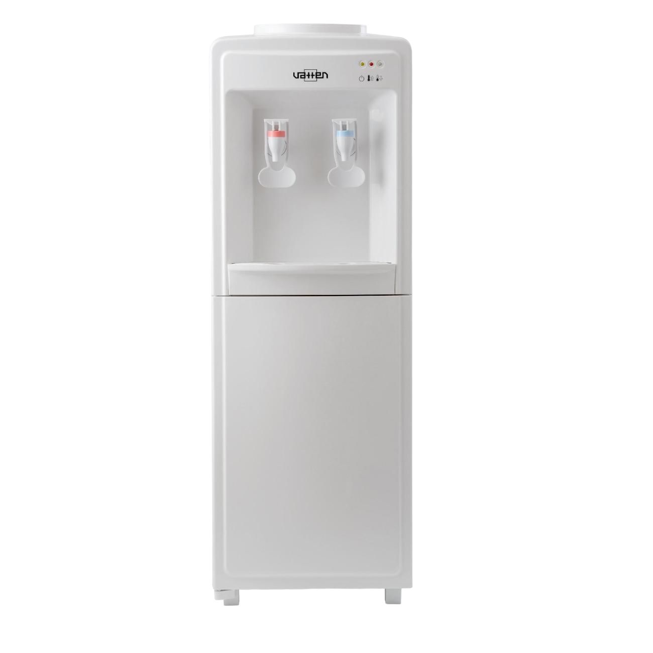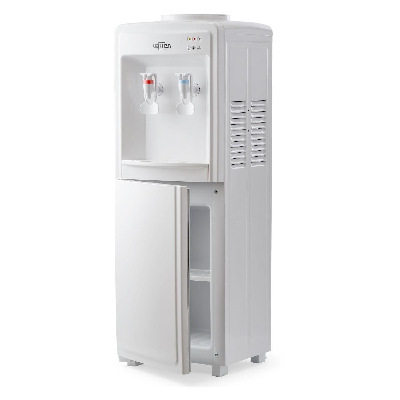 Белый кулер Vatten V09WE с двумя краниками оснащен электронной системой охлаждения и встроенным шкафчиком объемом 9 л. Габариты модели — 83х29,6х30 см. Вес изделия — 6,95 кг. Производительность устройства при нагревании до 95°C составляет 6 л/ч, при охлаждении до 15°C — 0,6 л/ч. Мощность — 0,6 кВт/80 Вт. Корпус оснащен съемным лотком для сбора капель. Баки сделаны из стали с антикоррозийными свойствами и пищевого пластика. Способ размещения — напольный. Бутыль располагается в верхней части корпуса.
