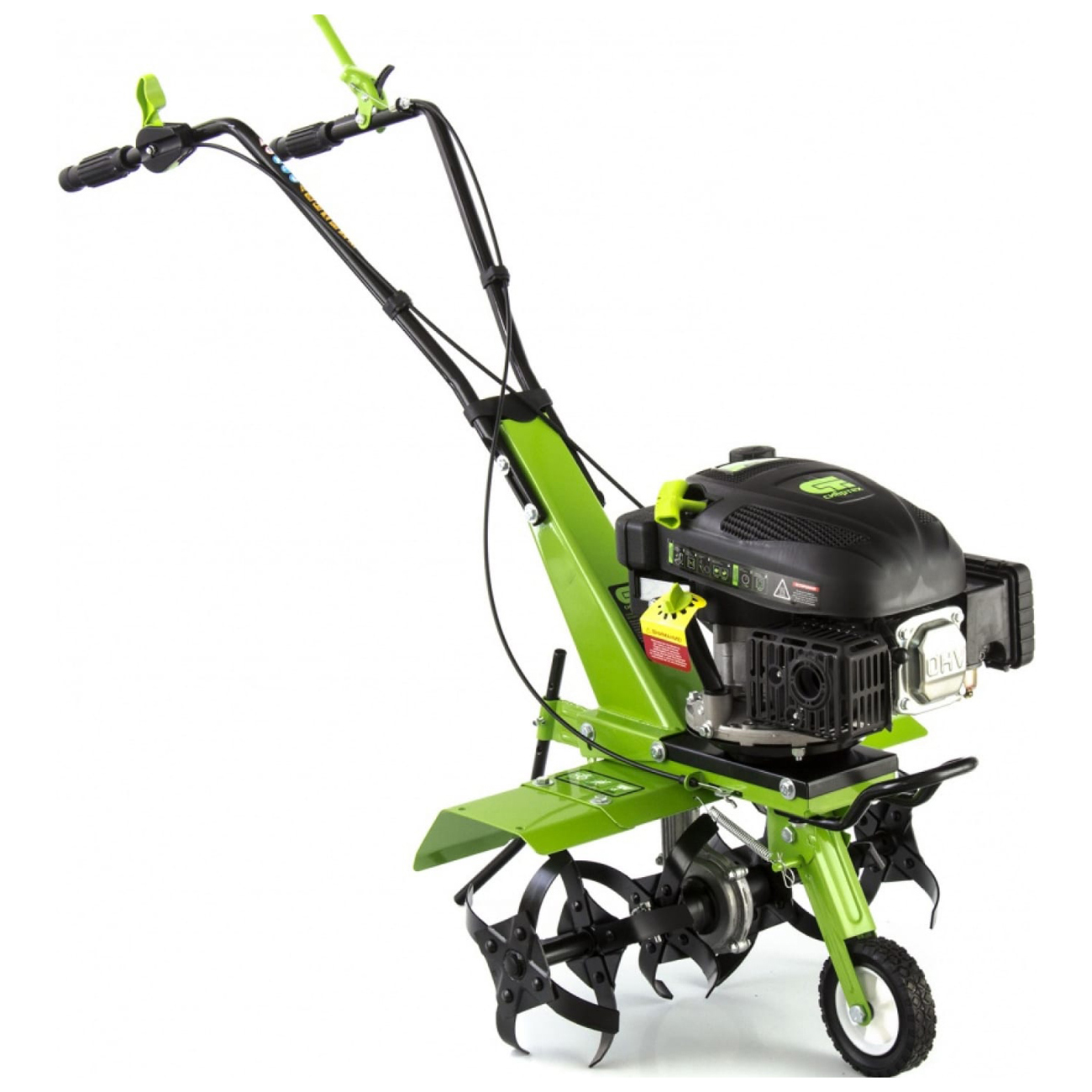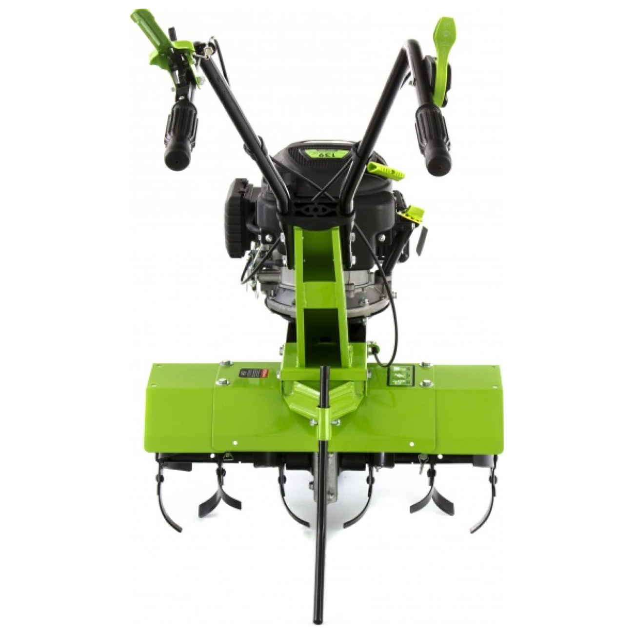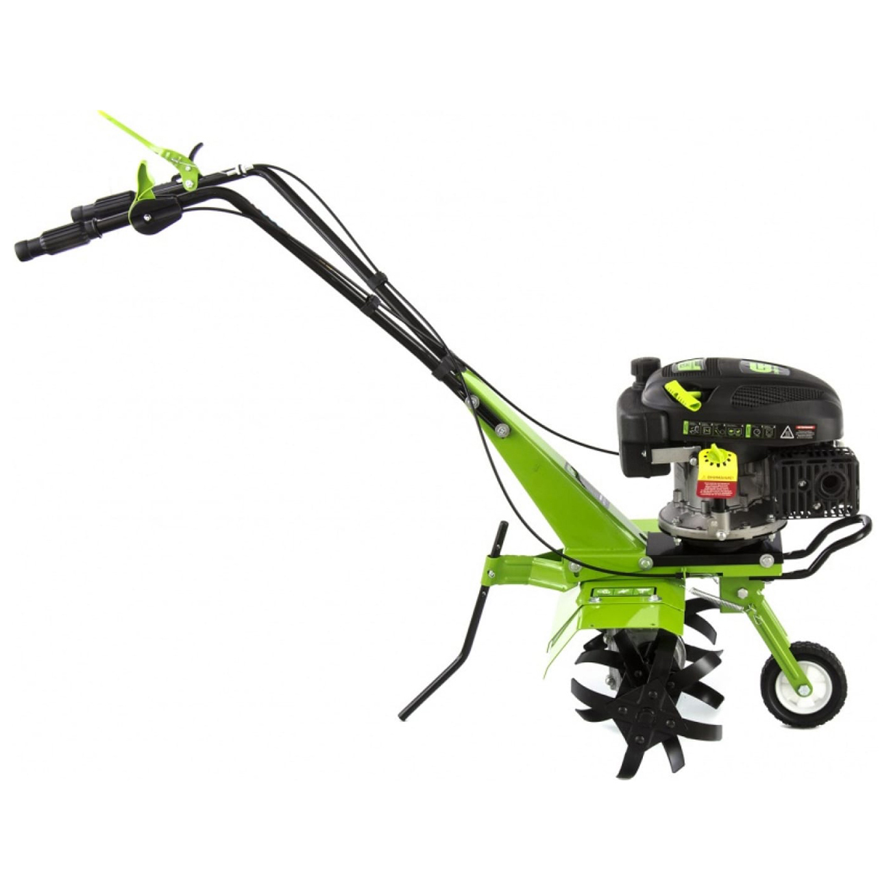 Вес культиватора — 38,5 кг. Для транспортировки есть колесо, которое вынесено на переднюю часть рамы. Специальный протектор обеспечивает проходимость устройства по мокрой и вязкой почве. Металлические крылья защищают пользователя от камней и грунта. Рукоятки с прорезиненными накладками создают комфортные условия при управлении культиватором. Для устойчивости в комплекте с устройством поставляется металлическая подножка.