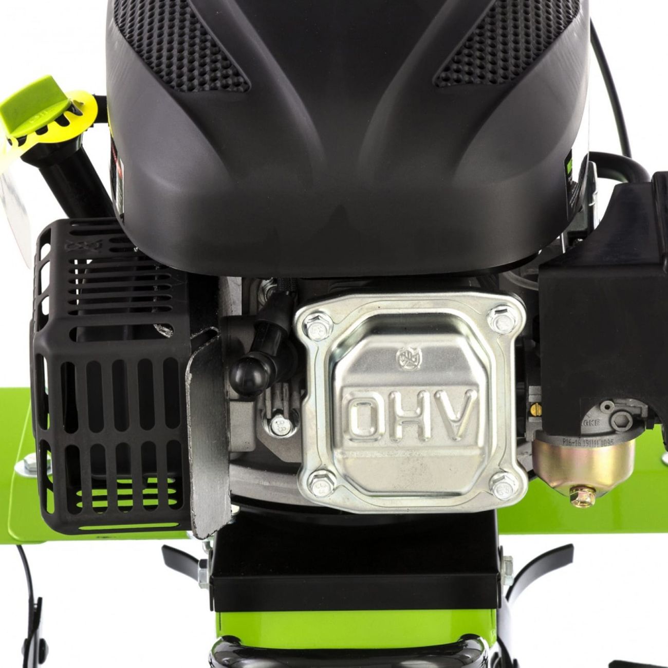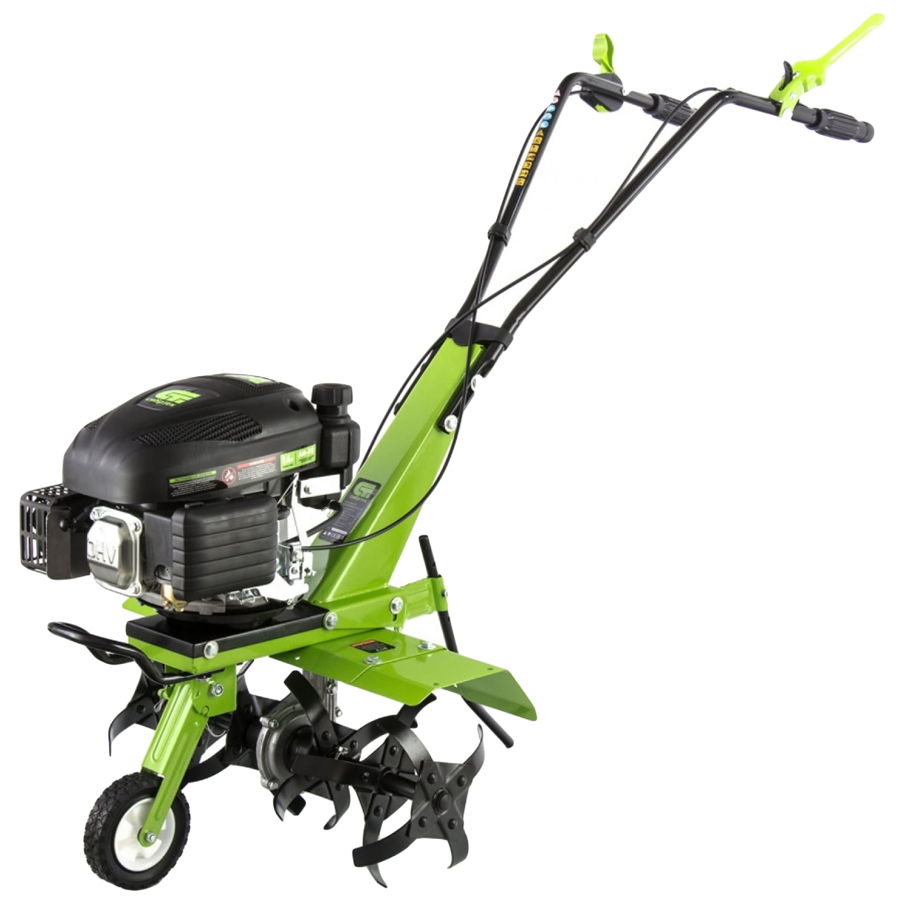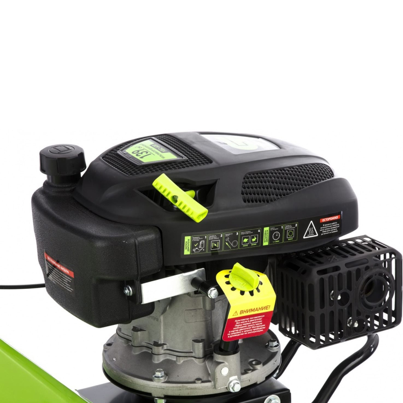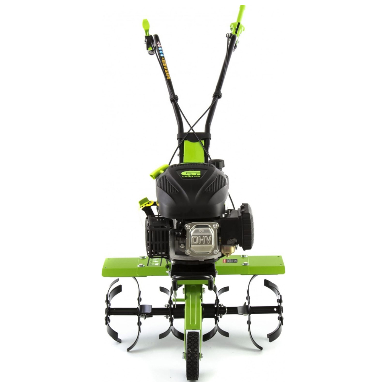 Вес культиватора — 38,5 кг. Для транспортировки есть колесо, которое вынесено на переднюю часть рамы. Специальный протектор обеспечивает проходимость устройства по мокрой и вязкой почве. Металлические крылья защищают пользователя от камней и грунта. Рукоятки с прорезиненными накладками создают комфортные условия при управлении культиватором. Для устойчивости в комплекте с устройством поставляется металлическая подножка.