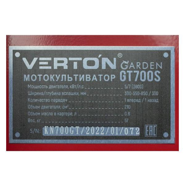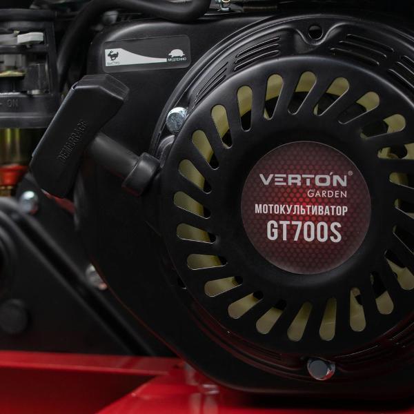 Verto Garden GT700S — бензиновый мотокультиватор, оснащенный четырехтактным одноцилиндровым мотором. Показатели холостого хода достигают 1400 об/мин. Установлен бак для горючего объемом 3,6 л. Передаточное число редуктора составляет 30:1. Максимальная мощность устройства — 5 кВт. Используется электронное зажигание с ручным запуском. Лезвия культиватора вращаются со скоростью 130 об/мин. Применяется ременное сцепление.