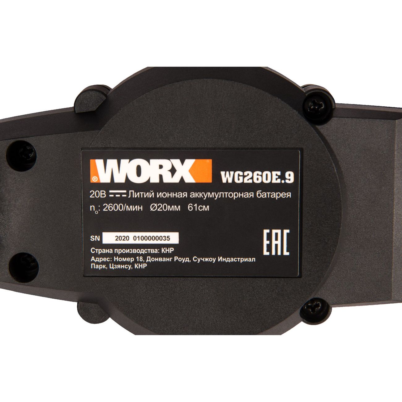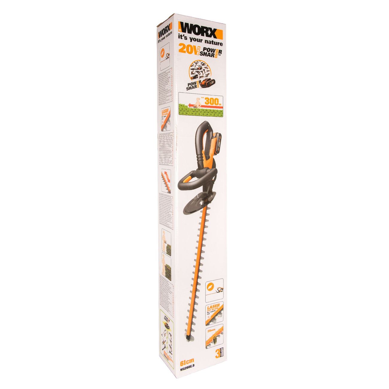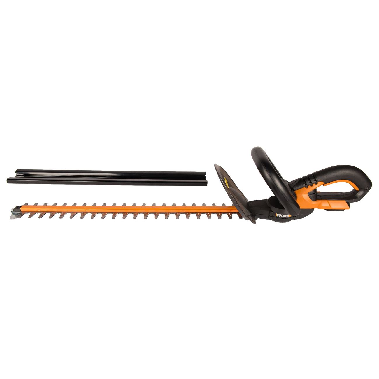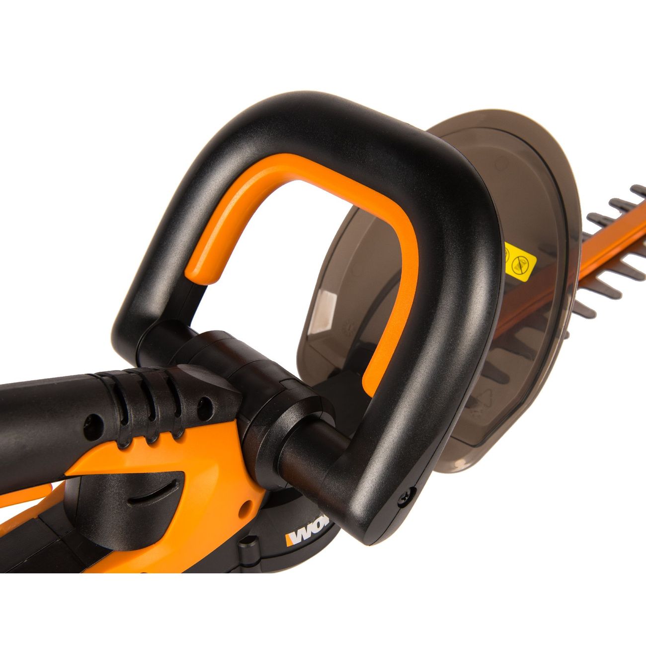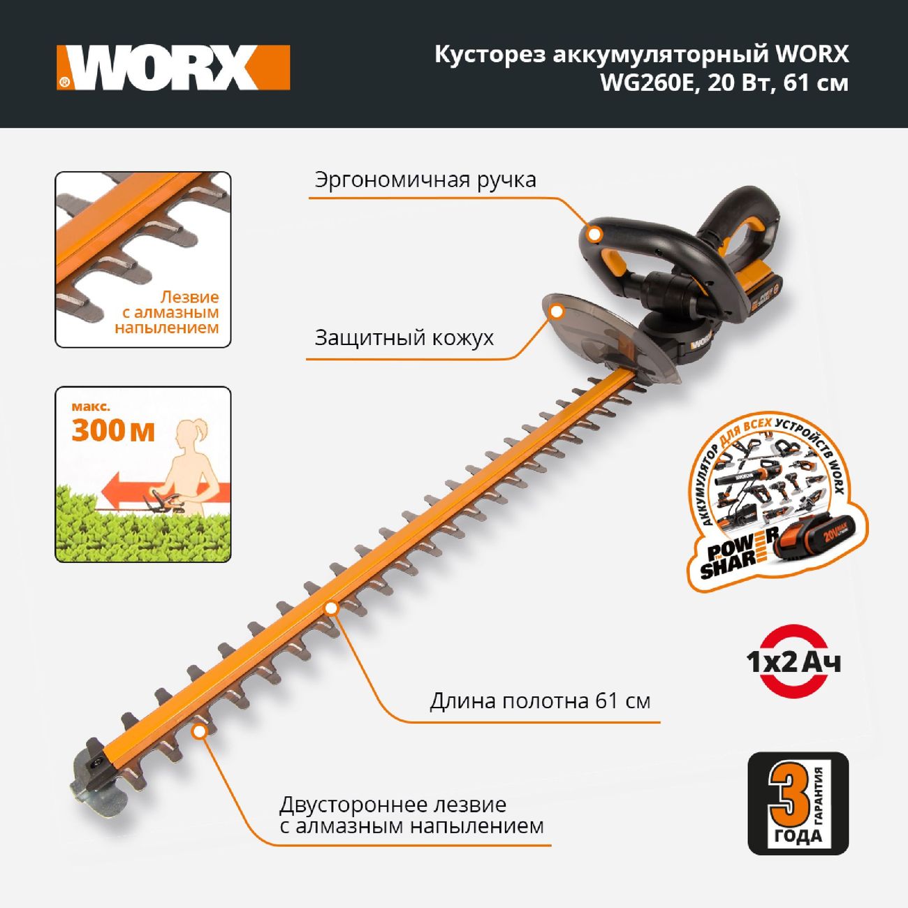 Электрический кусторез Worx WG260E комплектуется двусторонним рабочим полотном с алмазным напылением и лазерной заточкой, его длина — 61 см. Щеточный двигатель работает со скоростью до 2200 об/мин. Максимальный уровень шума — 90 дБ.