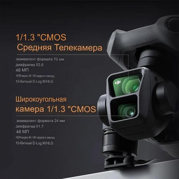 Квадрокоптер DJI Air 3 Fly More Combo — устройство в корпусе из металла и пластика, обладает камерой с разрешением матрицы 48 Мп для проведения фото и видеосъемки (3840х2160 пикселей). Частота кадров достигает 60 в секунду. Формат снимков — RAW, JPEG, DNG. Объем встроенной памяти — 8 Гб. При необходимости можно устанавливать карту формата microSD.