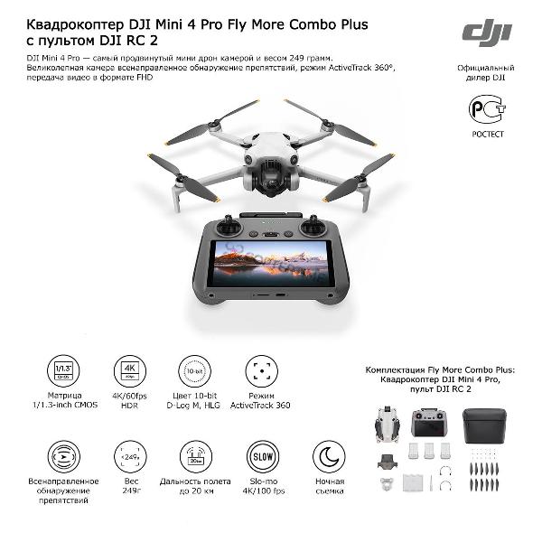 Вы можете купить Квадрокоптер DJI Mini 4 Pro Fly More Combo Plus в магазинах М.Видео по доступной цене. Квадрокоптер DJI Mini 4 Pro Fly More Combo Plus: подробное описание, фото и отзывы реальных покупателей, характеристики, возможность скачать инструкции и подобрать аксессуары.