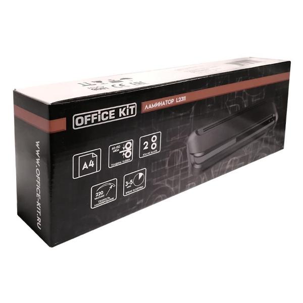 Пакетный ламинатор Office Kit L2311 черного цвета обладает габаритами 10,6х33х6 см. Масса прибора — 930 г. Уровень потребляемой мощности не превышает 265 Вт. Длина сетевого кабеля — 1,5 м. Корпус изготавливается из пластика. На лицевой стороне размещаются индикаторы включения, готовности к работе и нагрева. Присутствуют функции ламинирования фотографий и освобождения документов. Время нагрева — не более 5 минут.
