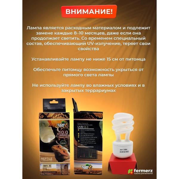 Вы можете купить Лампа FERMERZ Lucky Herp UVB 10.0 26Вт, E27для всех тропических и субтропических рептилий в магазинах М.Видео по доступной цене. Лампа FERMERZ Lucky Herp UVB 10.0 26Вт, E27для всех тропических и субтропических рептилий: подробное описание, фото и отзывы реальных покупателей, характеристики, возможность скачать инструкции и подобрать аксессуары.