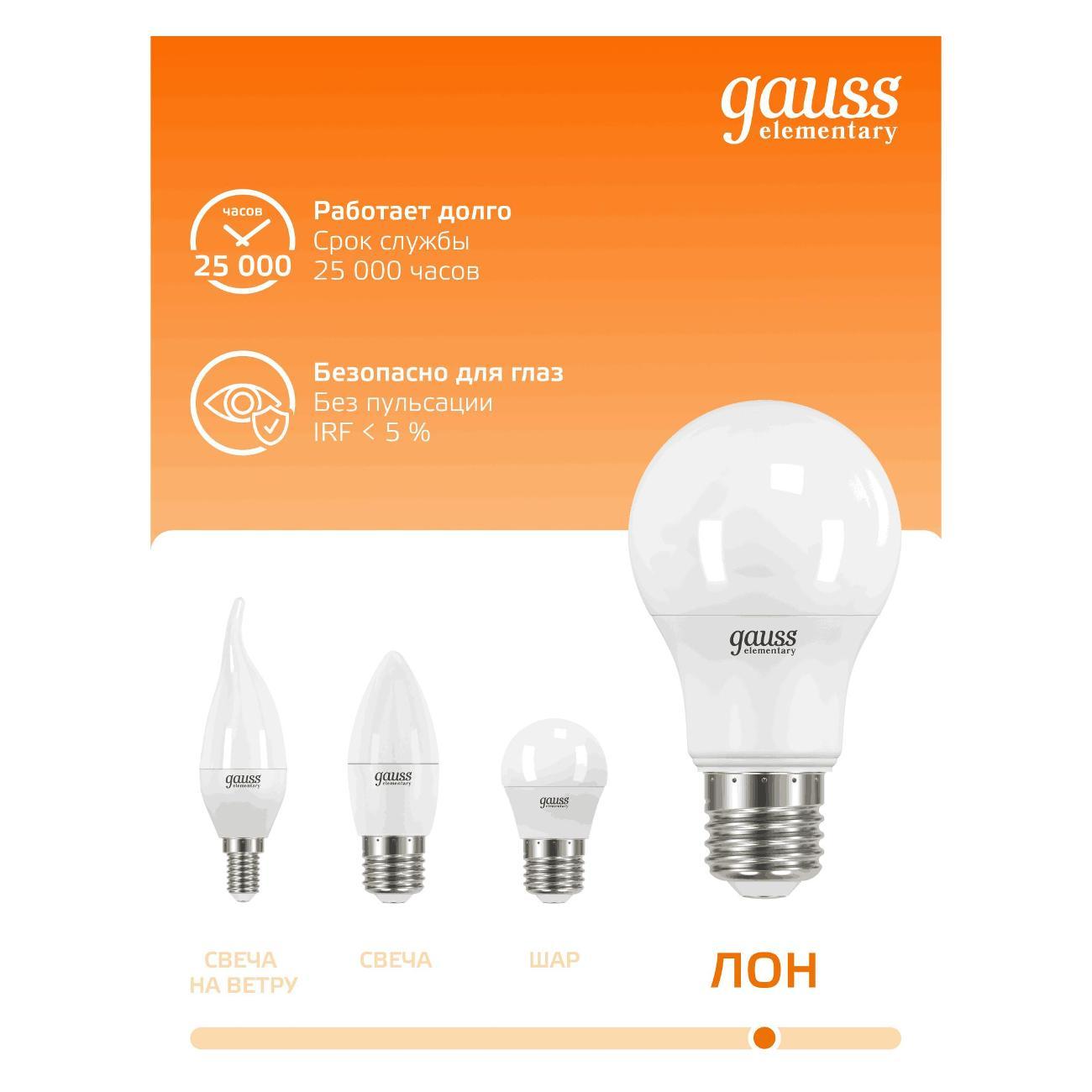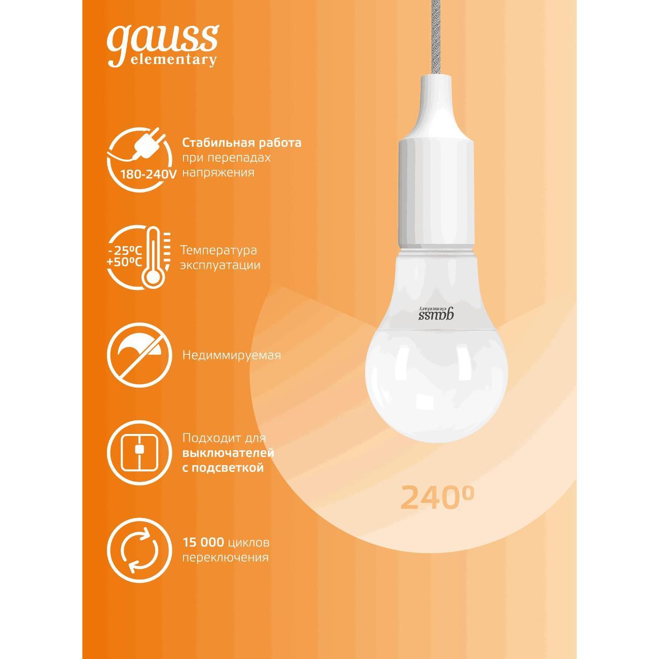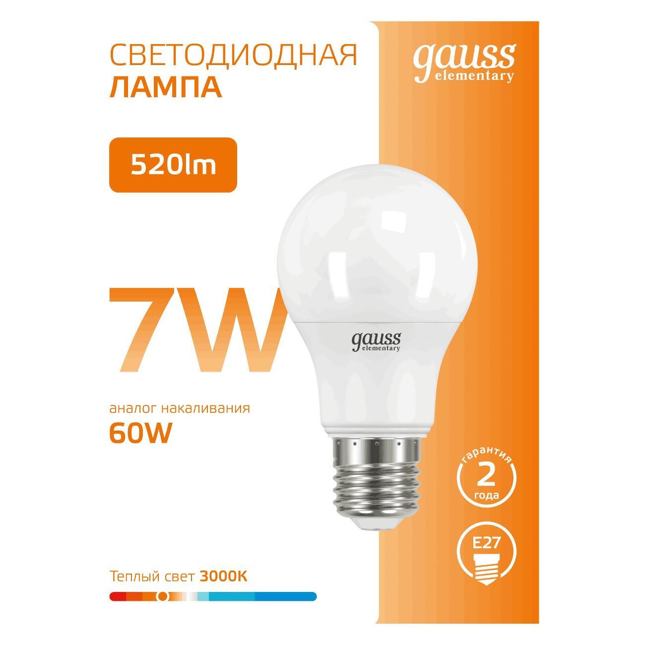 Вы можете купить Лампа Gauss Elementary A60 7W 520lm 3000K E27 LED в магазинах М.Видео по доступной цене. Лампа Gauss Elementary A60 7W 520lm 3000K E27 LED: подробное описание, фото и отзывы реальных покупателей, характеристики, возможность скачать инструкции и подобрать аксессуары.