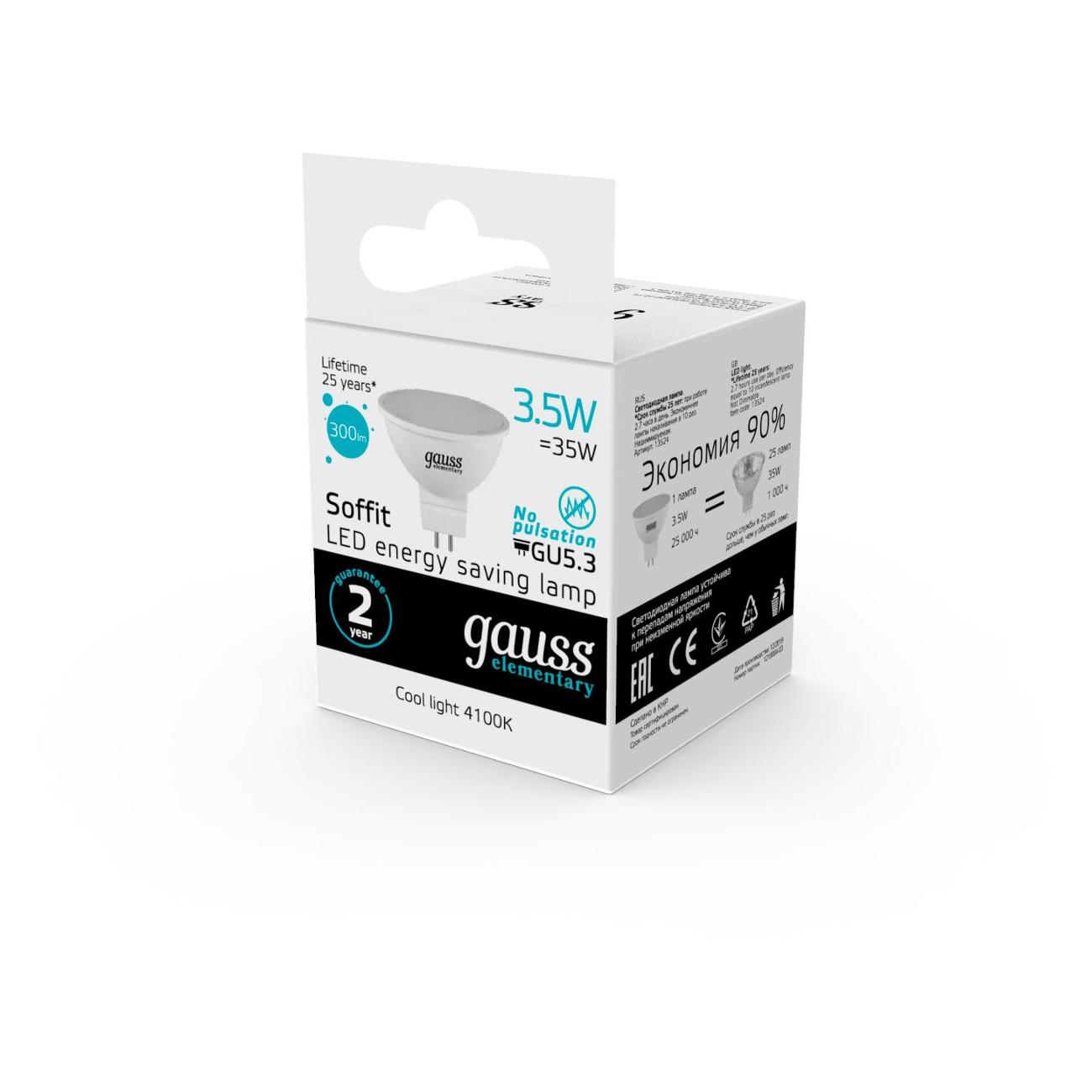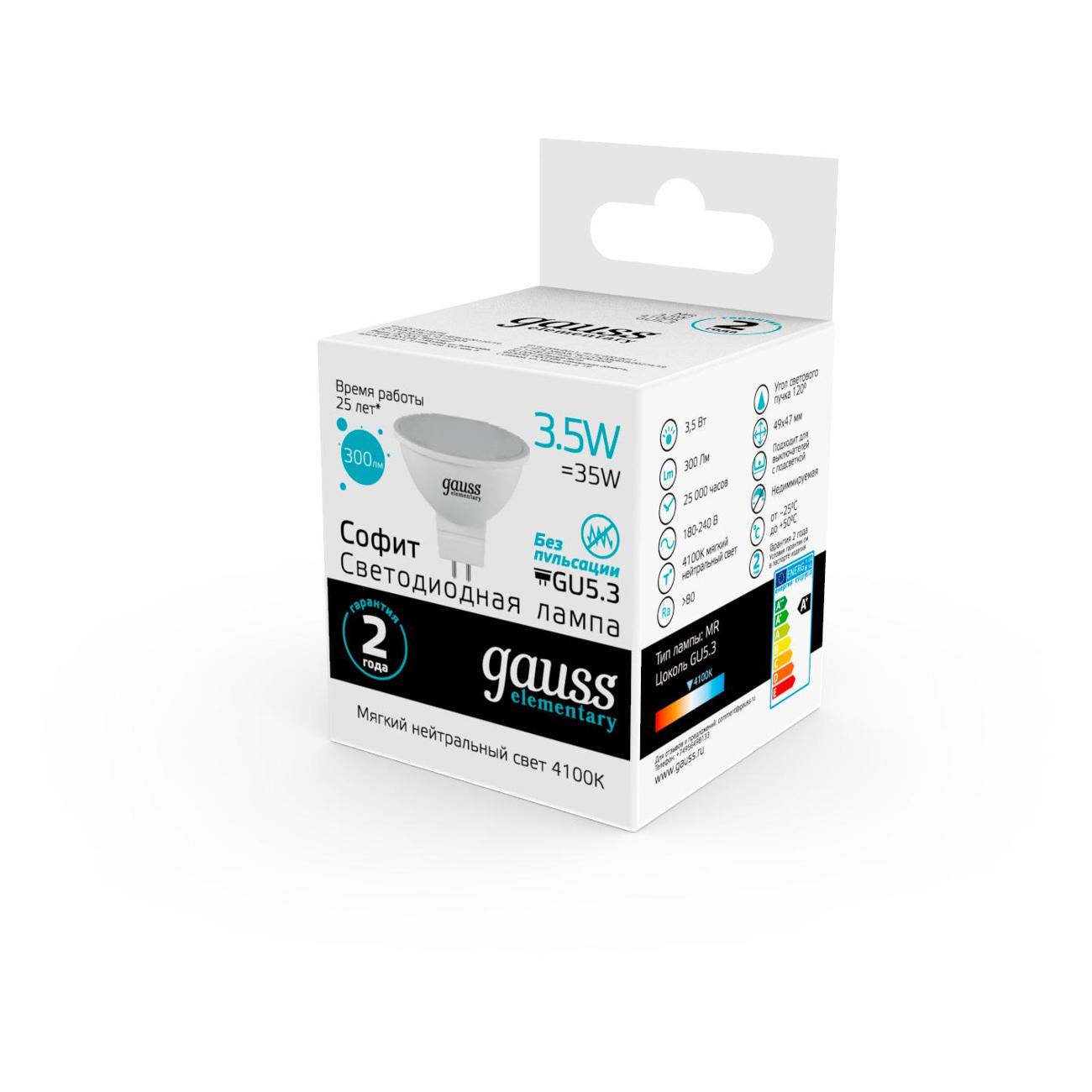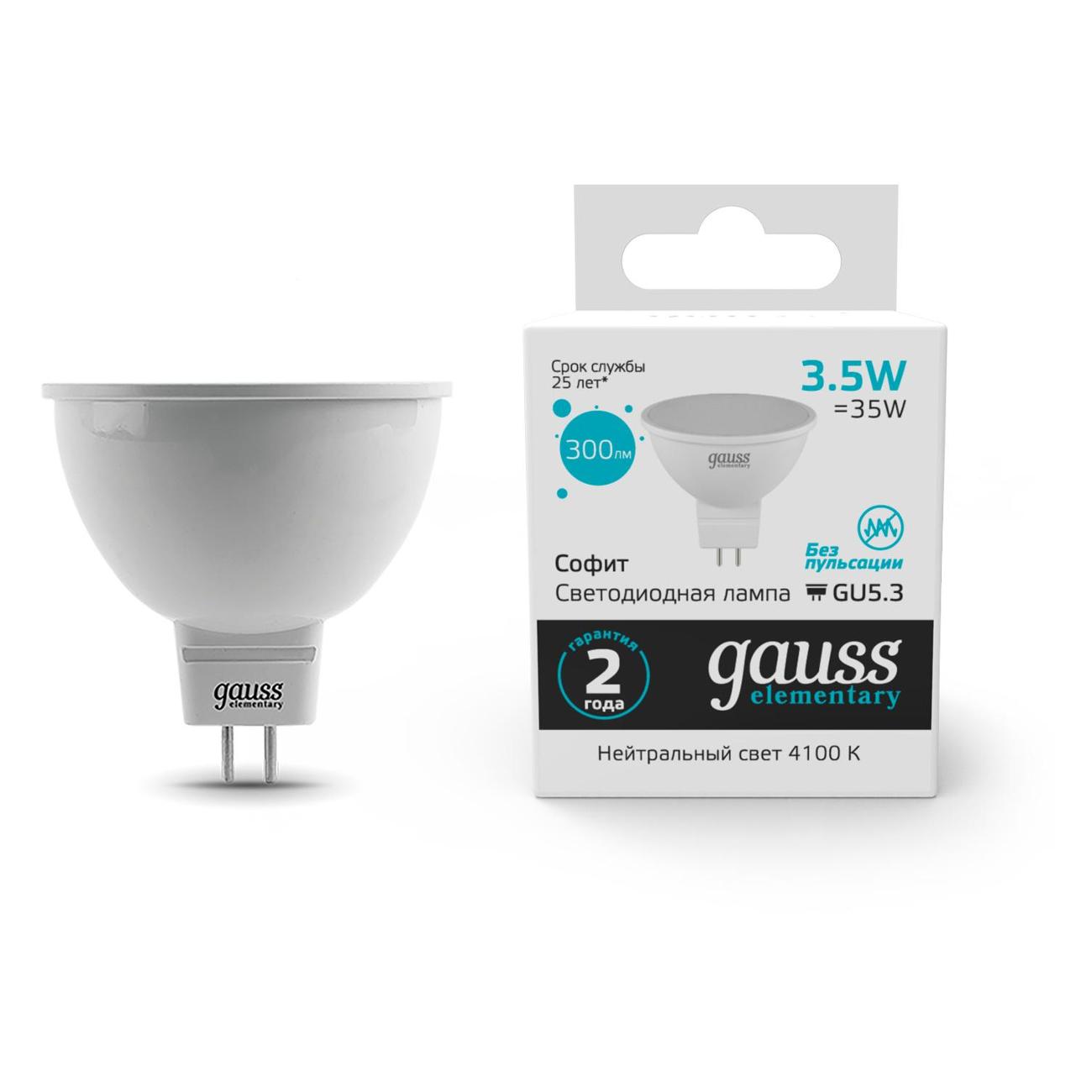 Вы можете купить Лампа Gauss Elementary MR16 3.5W 300lm 4100K GU5.3 LED в магазинах М.Видео по доступной цене. Лампа Gauss Elementary MR16 3.5W 300lm 4100K GU5.3 LED: подробное описание, фото и отзывы реальных покупателей, характеристики, возможность скачать инструкции и подобрать аксессуары.