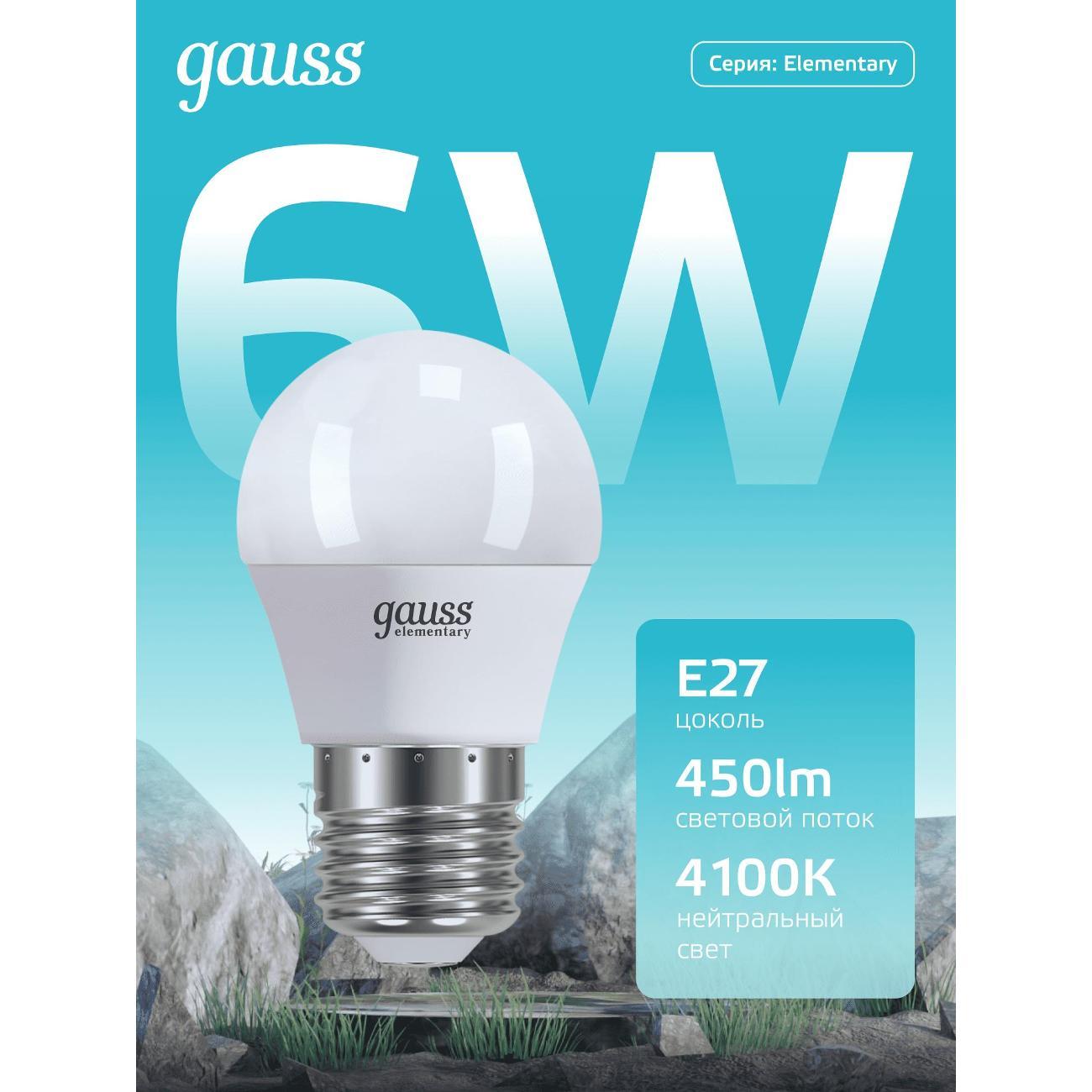 Вы можете купить Лампа Gauss Elementary Шар 6W 450lm 4100K Е27 LED в магазинах М.Видео по доступной цене. Лампа Gauss Elementary Шар 6W 450lm 4100K Е27 LED: подробное описание, фото и отзывы реальных покупателей, характеристики, возможность скачать инструкции и подобрать аксессуары.
