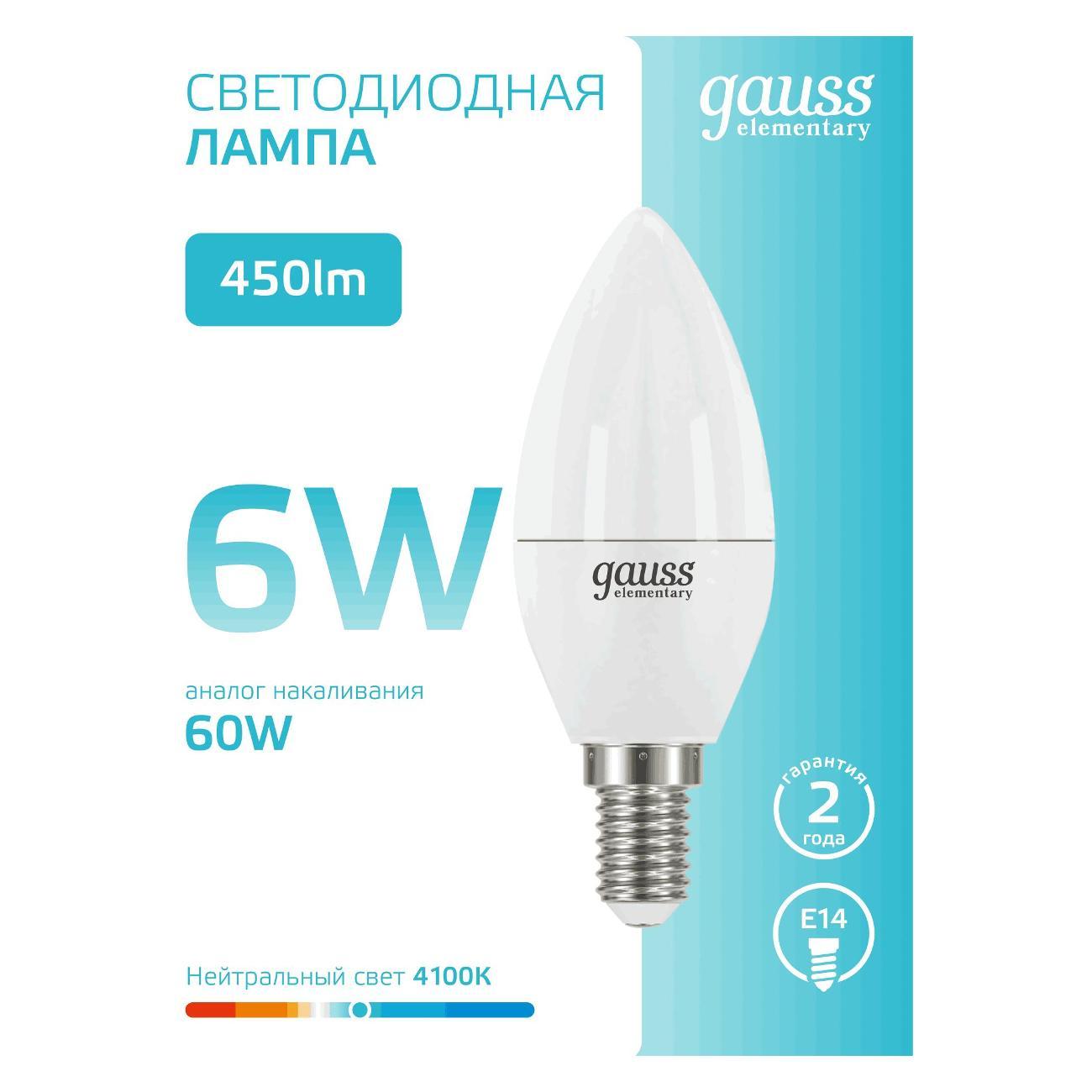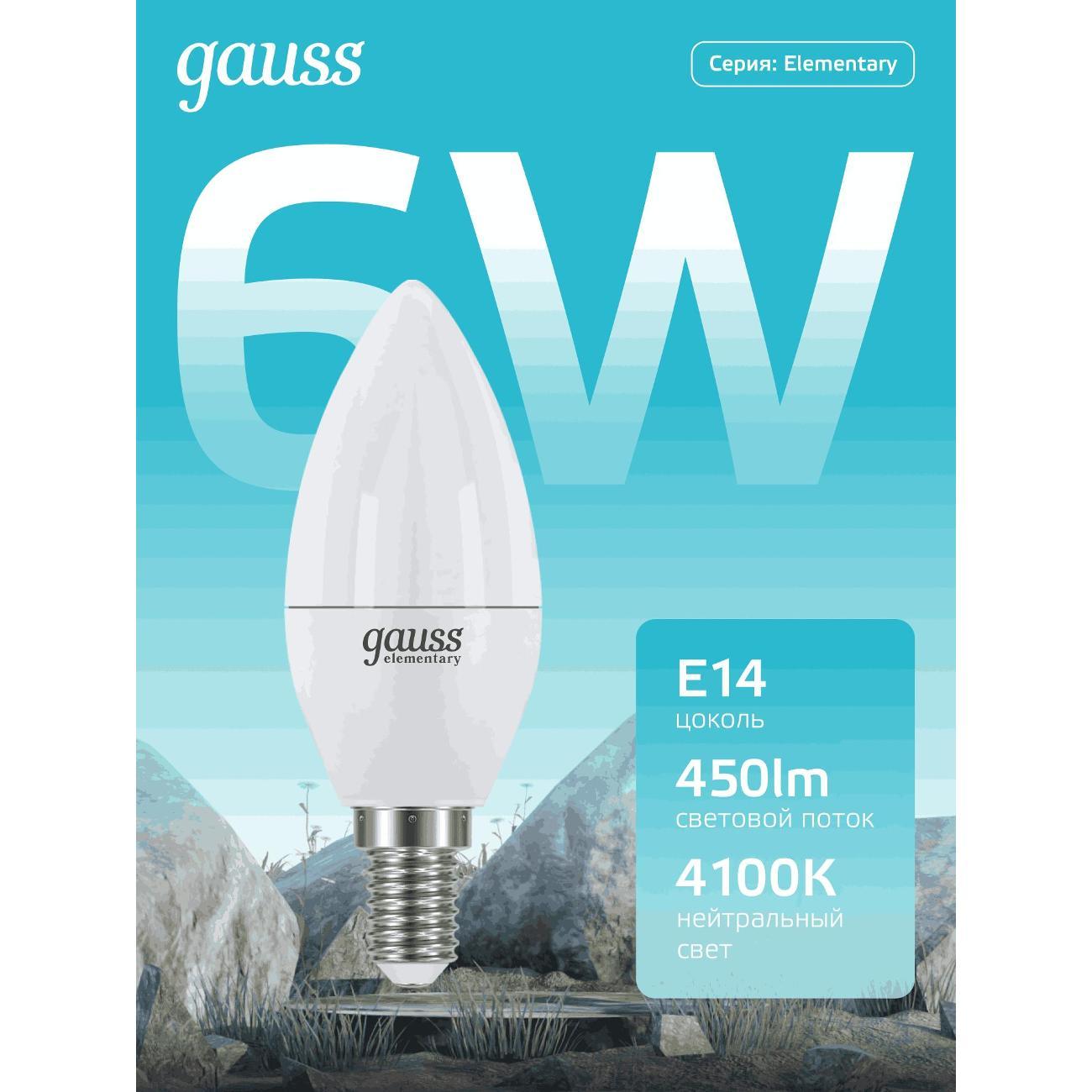 Вы можете купить Лампа Gauss Elementary Свеча 6W 450lm 4100K Е14 LED (10 шт.) в магазинах М.Видео по доступной цене. Лампа Gauss Elementary Свеча 6W 450lm 4100K Е14 LED (10 шт.): подробное описание, фото и отзывы реальных покупателей, характеристики, возможность скачать инструкции и подобрать аксессуары.