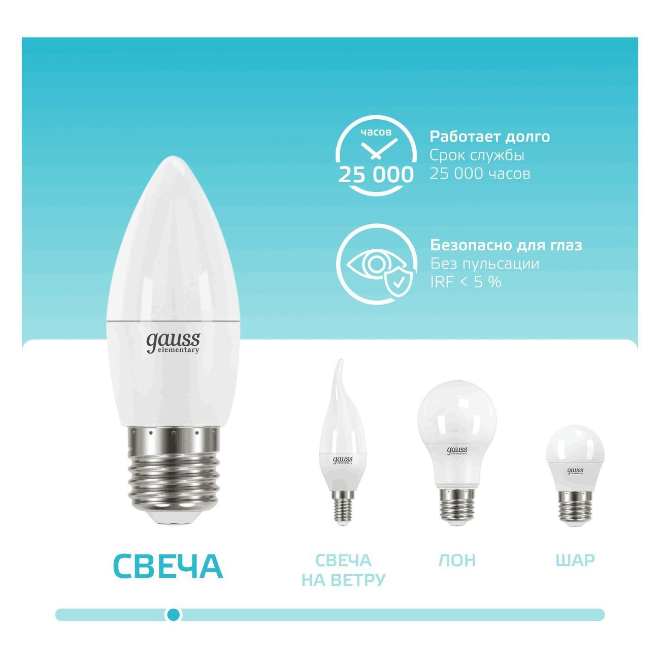 Вы можете купить Лампа Gauss Elementary Свеча 8W 540lm 4100K Е27 LED в магазинах М.Видео по доступной цене. Лампа Gauss Elementary Свеча 8W 540lm 4100K Е27 LED: подробное описание, фото и отзывы реальных покупателей, характеристики, возможность скачать инструкции и подобрать аксессуары.
