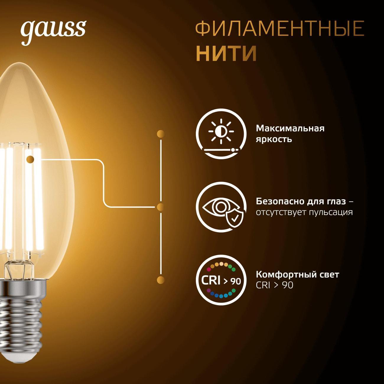 Вы можете купить Лампа Gauss Filament Свеча 11W 810lm 2700К Е14 LED (10 шт.) в магазинах М.Видео по доступной цене. Лампа Gauss Filament Свеча 11W 810lm 2700К Е14 LED (10 шт.): подробное описание, фото и отзывы реальных покупателей, характеристики, возможность скачать инструкции и подобрать аксессуары.