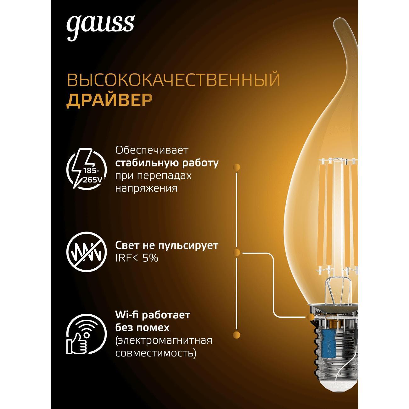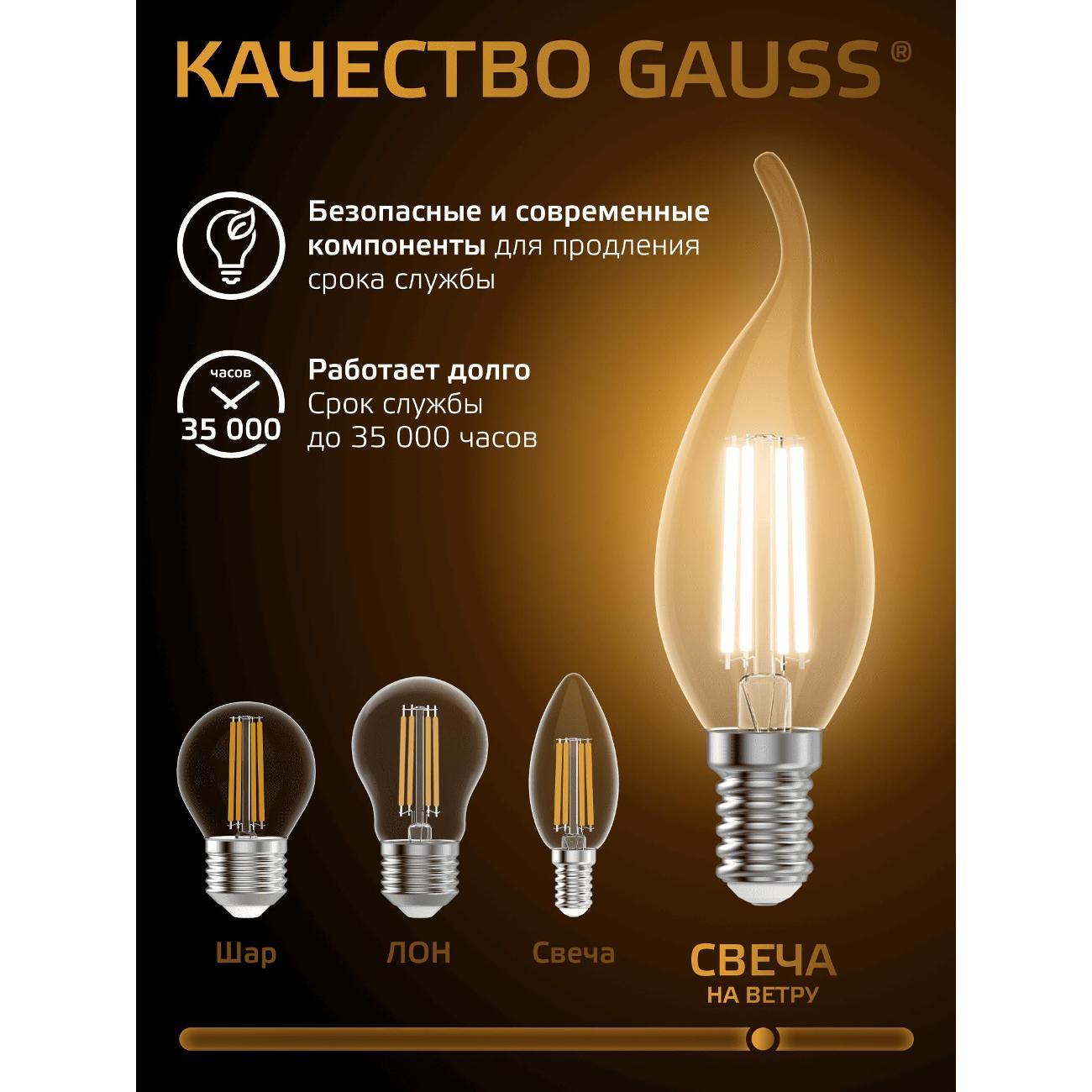 Вы можете купить Лампа Gauss Filament Свеча на ветру 5W 420lm 2700К Е14 LED (10 шт.) в магазинах М.Видео по доступной цене. Лампа Gauss Filament Свеча на ветру 5W 420lm 2700К Е14 LED (10 шт.): подробное описание, фото и отзывы реальных покупателей, характеристики, возможность скачать инструкции и подобрать аксессуары.