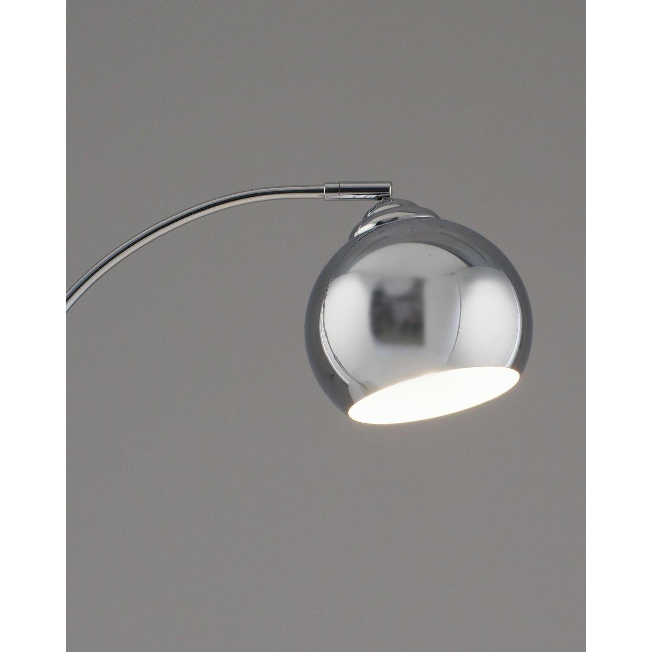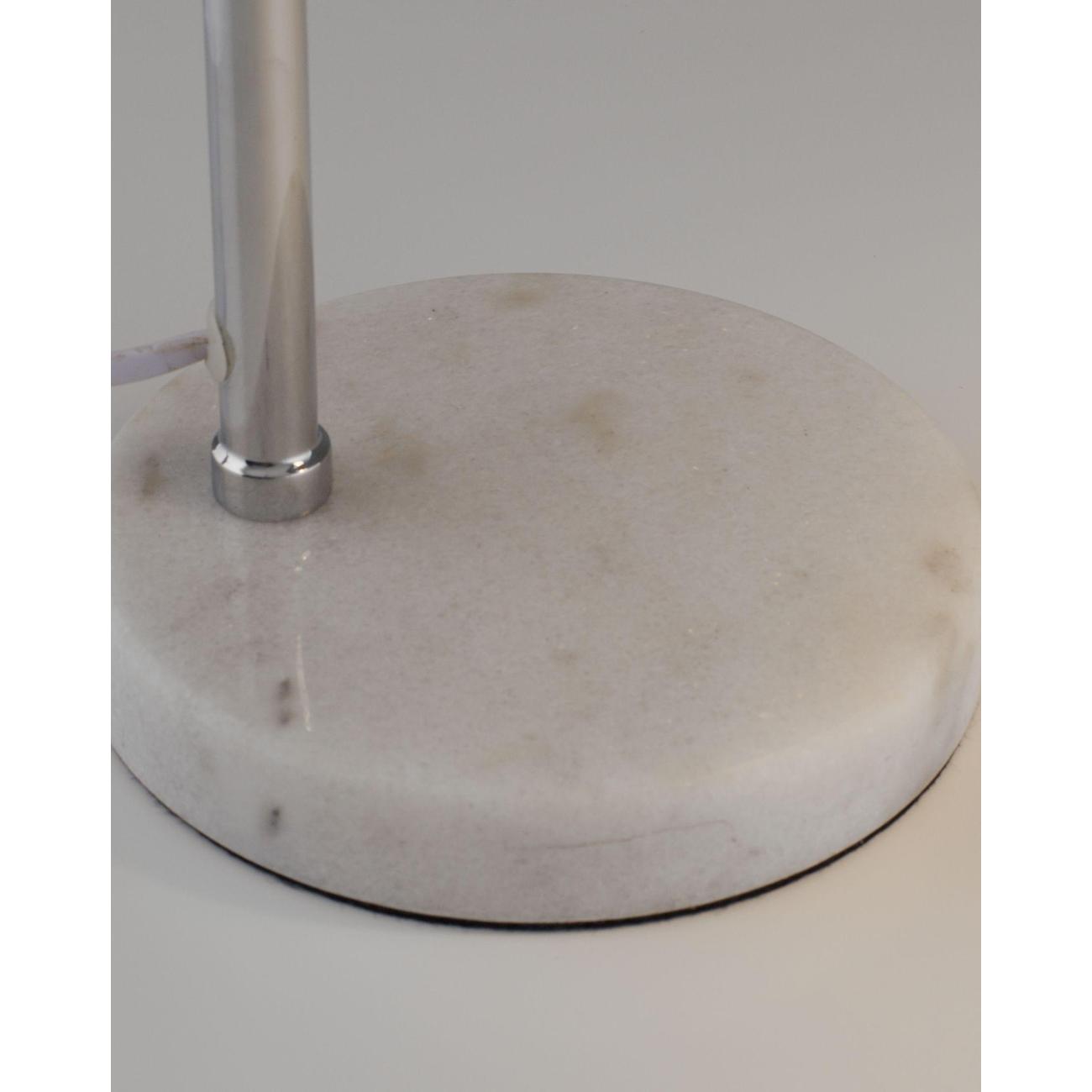 Особенности дизайна. Плафон выполнен из металла в цвете хром с изысканным глянцевым покрытием, что придает лампе строгий и минималистичный вид. Мраморное белое основание добавляет ей утонченности и веса, а изогнутый металлический корпус с полукруглым плафоном создает мягкое, рассеянное освещение.