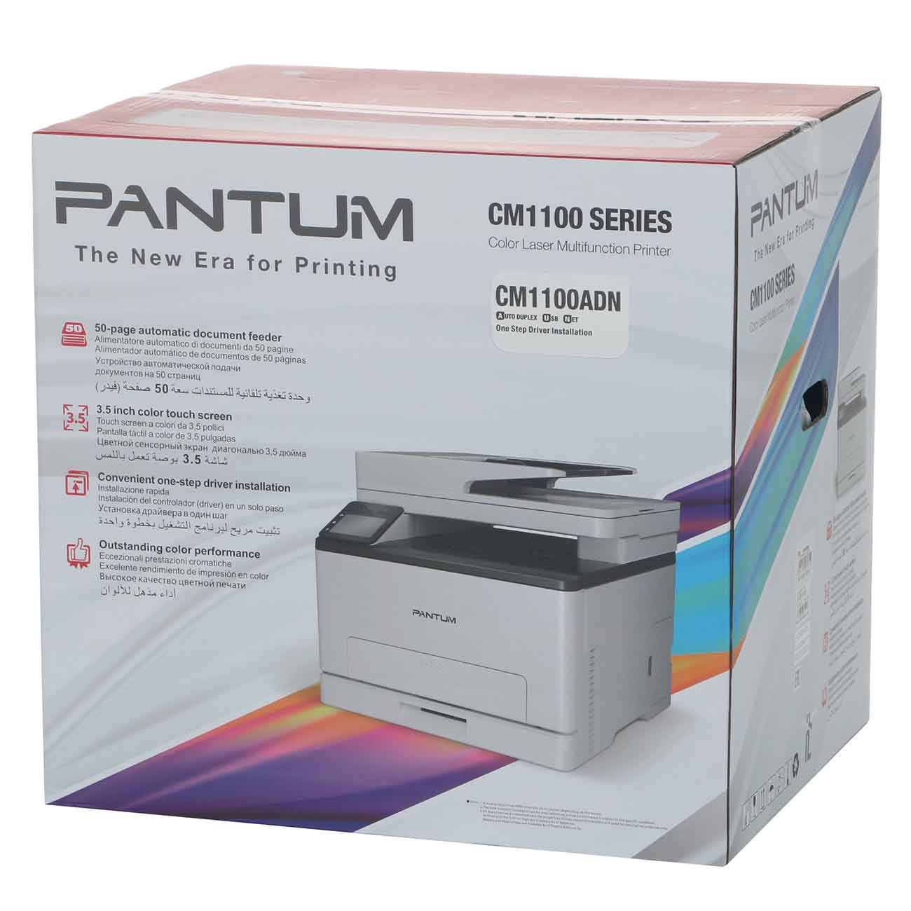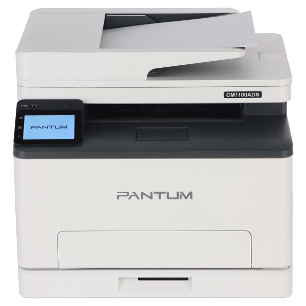 Лазерное МФУ (цветное) Pantum CM1100ADN белого цвета идет в комплекте с четырьмя картриджами. Уровень шума во время печати не превышает 54 дБ. Связь с компьютером обеспечивается с помощью USB 2.0. Прибор совместим с операционными программами Windows, Linux, Mac OS. Габариты модели — 31,4х40,1х41,1 см. Вес изделия — 18,5 кг. Мощность — 0,38 кВт. Присутствует сенсорный экран. Устройство оснащено функцией двусторонней автоматической печати, режимом отключения звука. Максимальная нагрузка составляет 1500 листов в месяц.