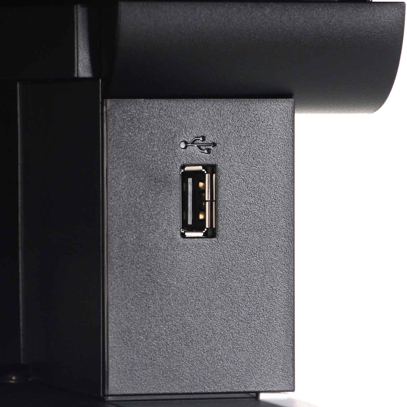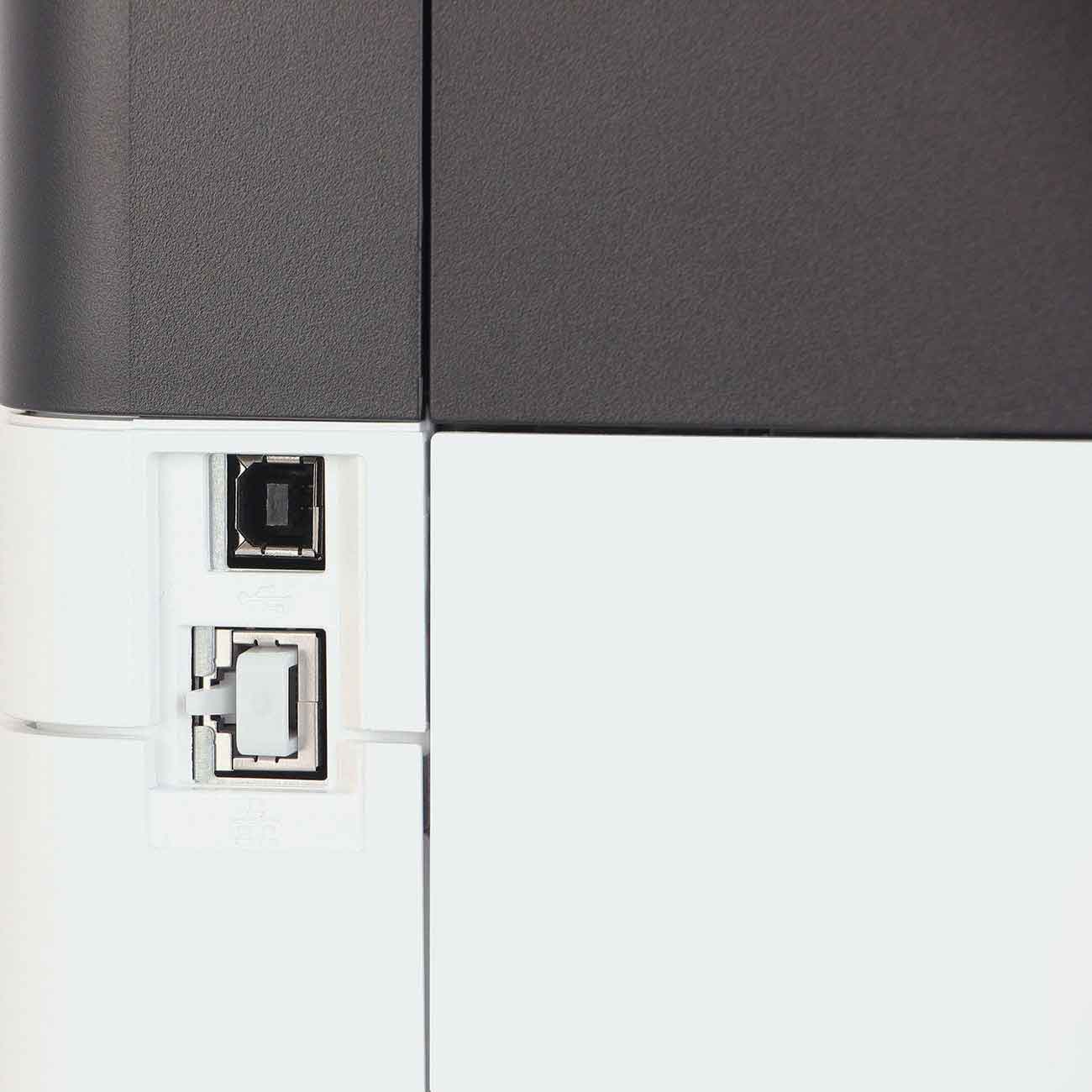 На корпусе есть разъёмы USB и RJ45, поэтому девайс легко подключается к компьютеру и становится частью локальной сети. Кнопочная панель и монохромный дисплей позволяют быстро выставлять оптимальные настройки, а также менять и контролировать очередь заданий.