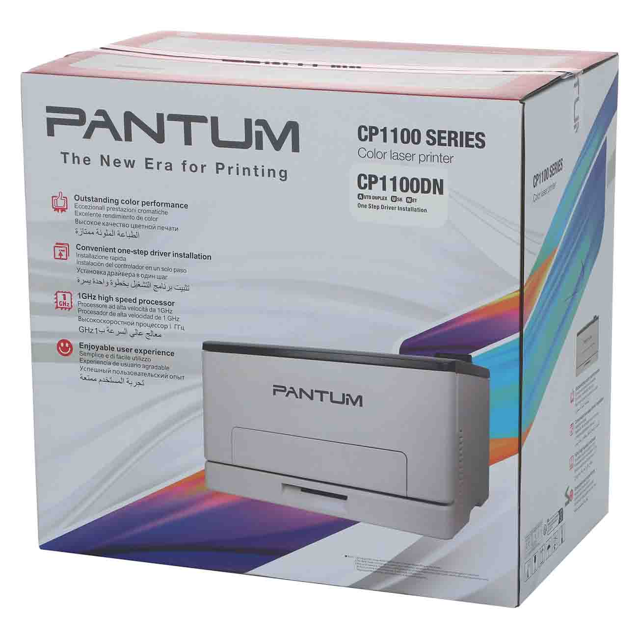 Лазерный принтер Pantum CP1100DN белого цвета идет в комплекте с четырьмя картриджами. Корпус сделан из прочного легкого пластика. Уровень шума во время печати не превышает 52 дБ. Соединение с ПК обеспечивается с помощью USB и LAN. Габариты модели — 24,1х40,1х41,1 см. Вес изделия — 16,3 кг. Мощность — 0,38 кВт. Устройство совместимо с операционными системами Windows, Linux, Mac OS. Лоток для подачи бумаги вмещает до 250 листов. Прибор оснащен встроенной памятью объемом 1 Гб. Максимальная нагрузка составляет до 30000 листов в месяц.