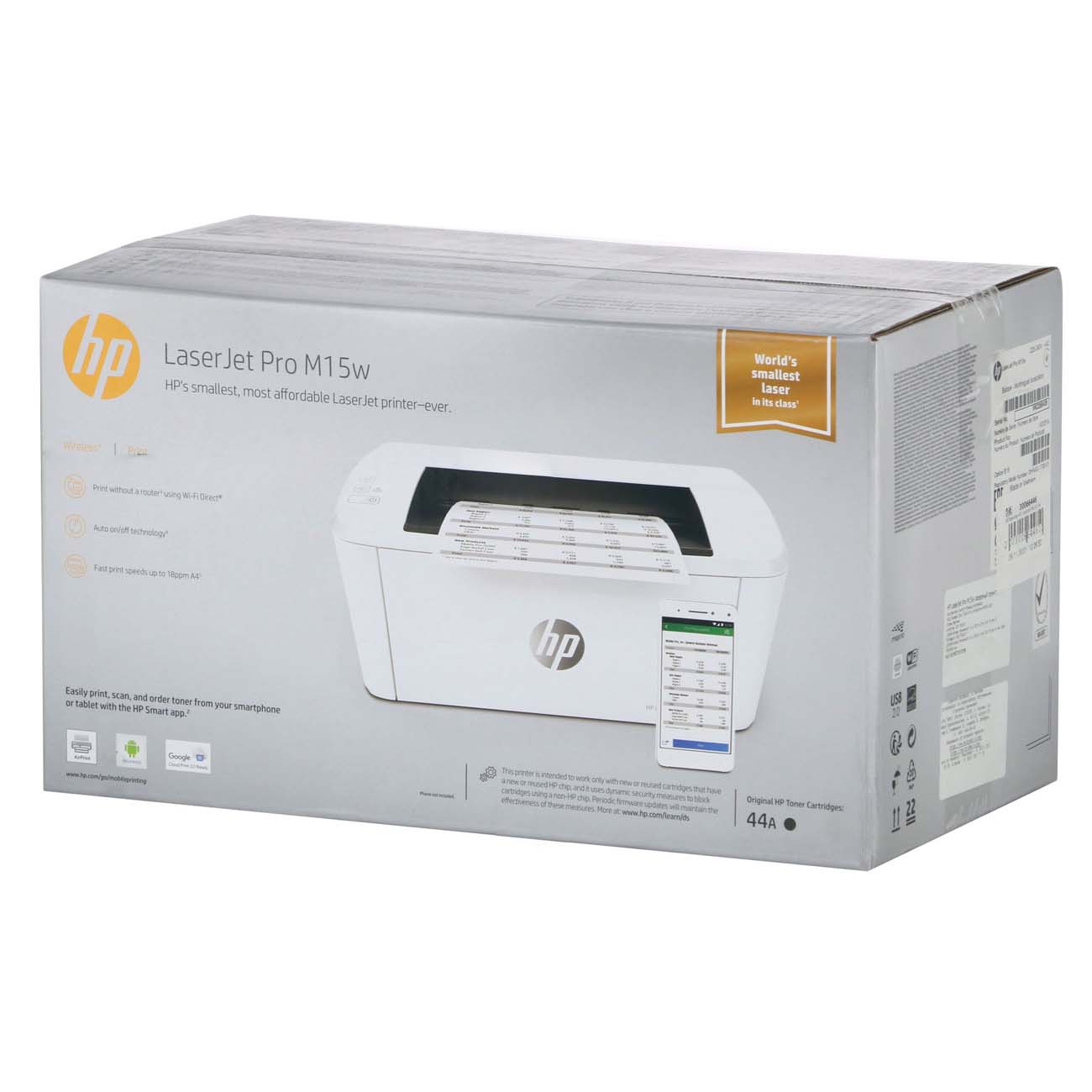 HP LaserJet Pro M15w W2G51A подключается к ПК и другим носителям информации с помощью интерфейса USB 2.0 и модуля Wi-Fi 802.11b/g/n, который обеспечивает беспроводную связь при частоте 2,4 ГГц. Прибор поддерживает мобильные технологии печати Android Print Service Plugin, Apple AirPrint, ePrint. Для управления предусмотрен блок сенсорных клавиш. Приложение HP Smart позволяет выполнять необходимые настройки с помощью смартфона.