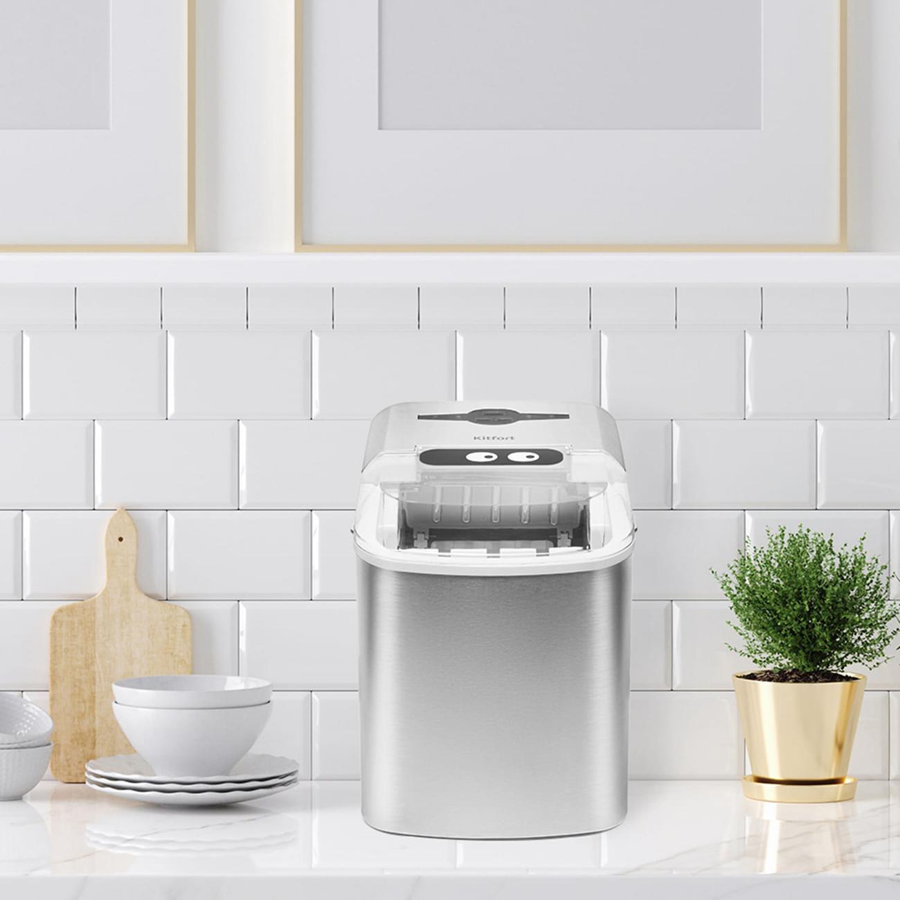 Льдогенератор Kitfort КТ-1817 производит до 15 кг пищевого льда в сутки, не требуя подключения к водопроводу. Полученные фигурки в форме наперстков хорошо пропускают жидкости, которые нужно охладить. Также их можно раскрошить в блендере.