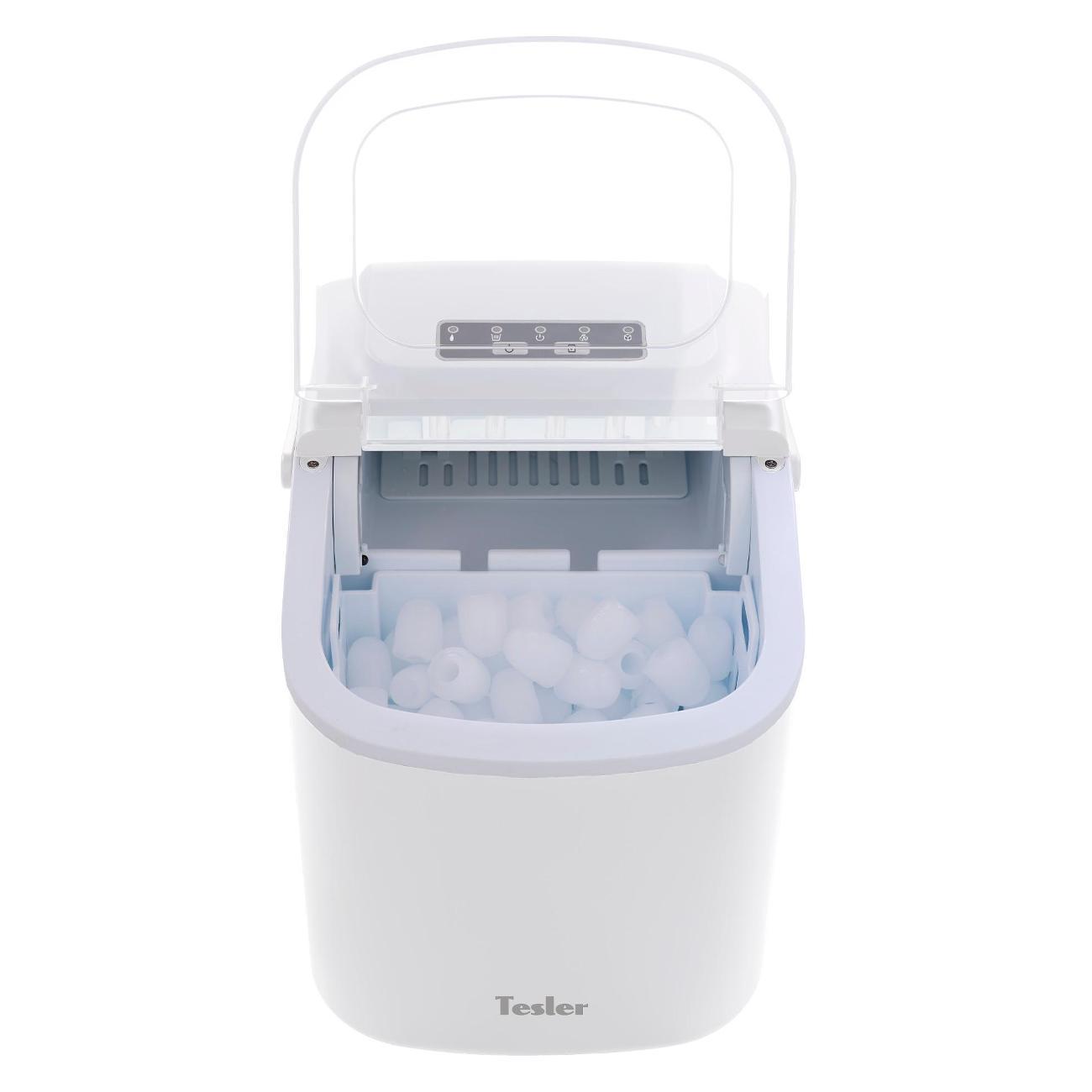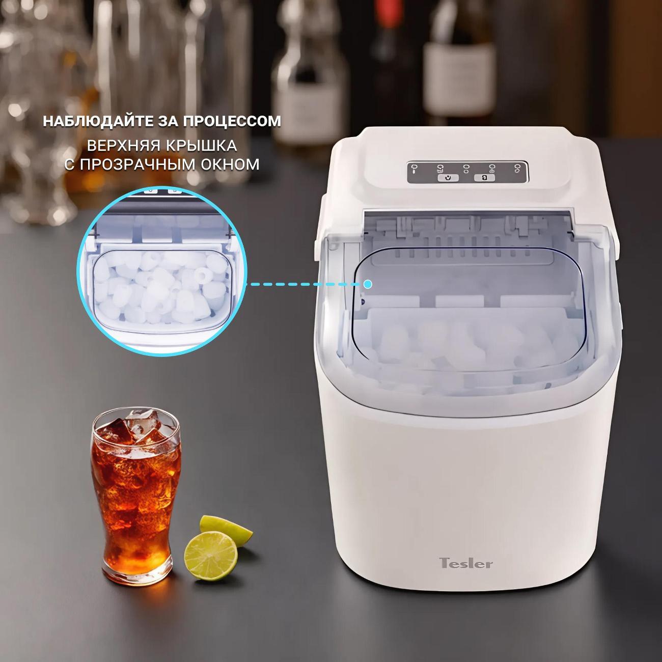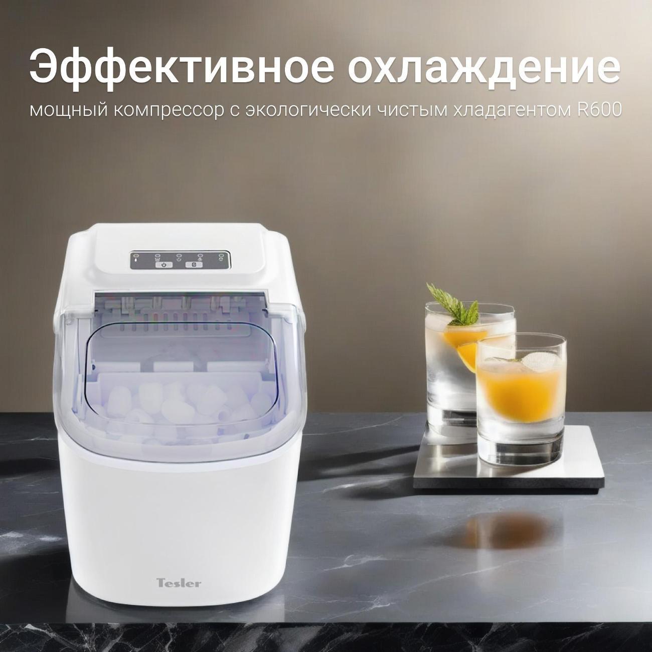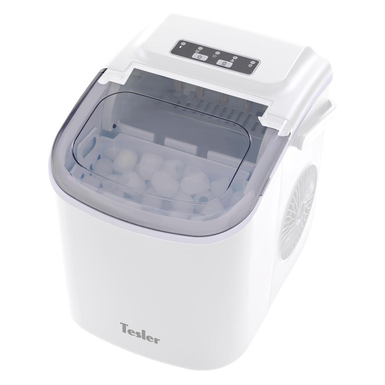 Ледогенератор Tesler ICM-1201, белый, производит пальчиковый лед для добавления в напитки, охлаждения бутылок и других нужд. Лед удобно использовать целым или перемалывать в блендере. Можно выбрать маленький или большой размер, в зависимости от этого продолжительность цикла будет составлять от 6 до 12 минут. Производительность достигает 12 кг льда в сутки, за один цикл производится девять пальчиков. Объем резервуара для воды составляет 1,3 л, корзина для льда вмещает 0,6 кг.