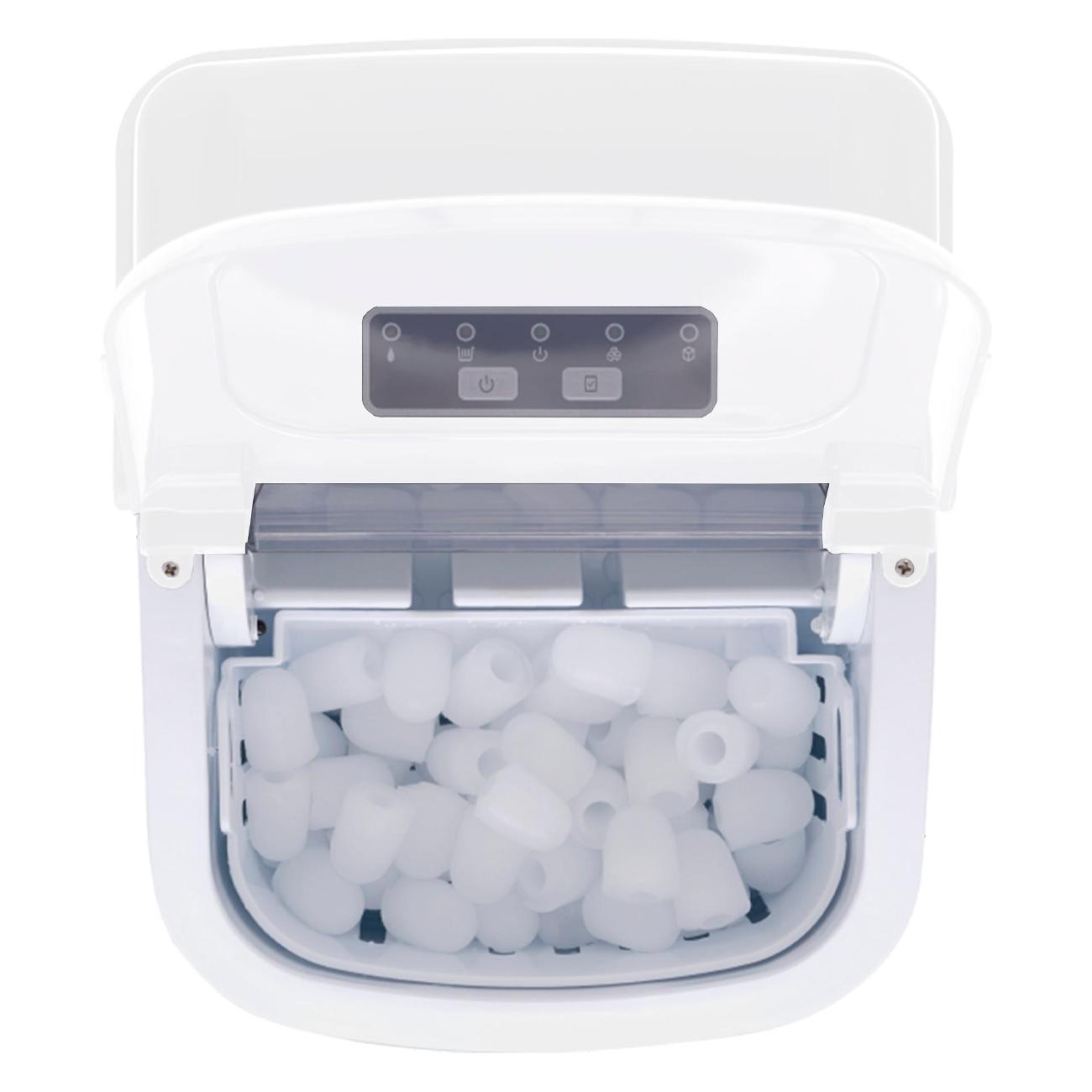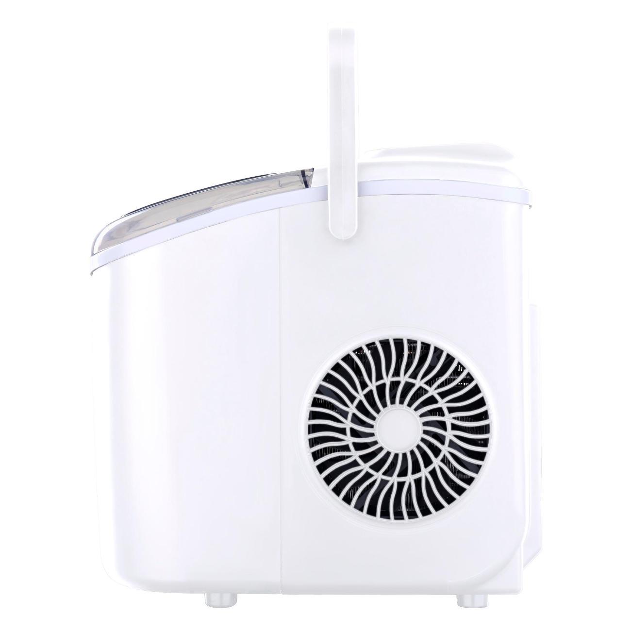 Управление электронное, панель со светодиодными индикаторами параметров работы удобно расположена на верхней стороне корпуса. О уровне воды и льда оповещают индикаторы. Питание производится от бытовой электросети напряжением 220-240 В, 50 Гц, потребляемая мощность — 90 Вт. Уровень шума при работе достигает 43 дБ. Корпус изготовлен из пластика, для удобства переноса предусмотрена ручка. Прозрачная крышка даетвозможность наблюдать за ходом приготовления. Габариты ледогенератора: 222x294x290 мм, вес — 6,2 кг. В комплект входит совок для льда.