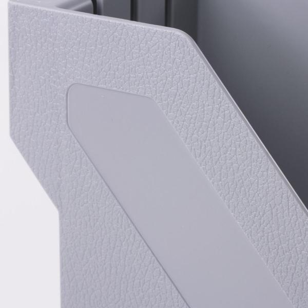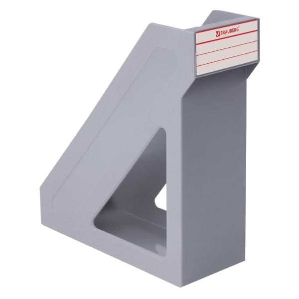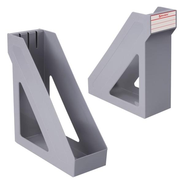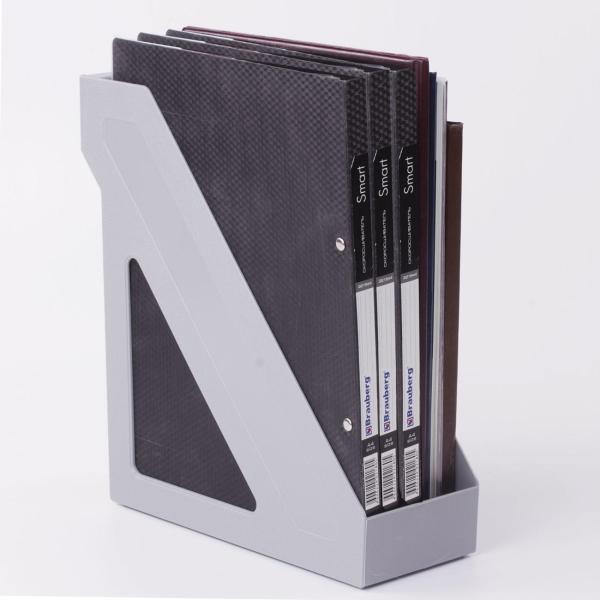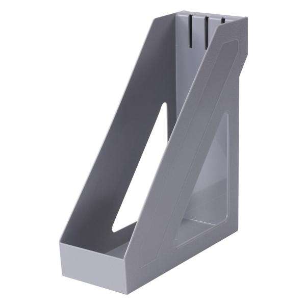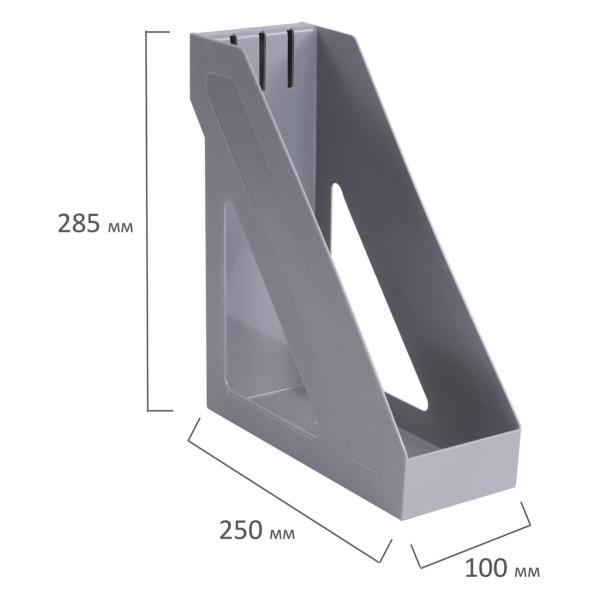 Выполнен в сером цвете, с одним отделением и с табличкой для маркировки. Предназначен для хранения бумаг формата А4. Представляет собой устойчивую неразборную конструкцию из гладкого пластика с шагреневыми вставками и отверстиями по бокам. Размеры: высота - 285 мм, ширина - 100 мм, глубина - 265 мм.