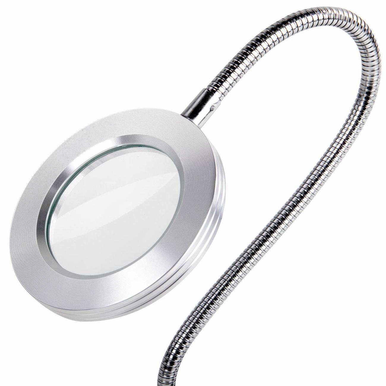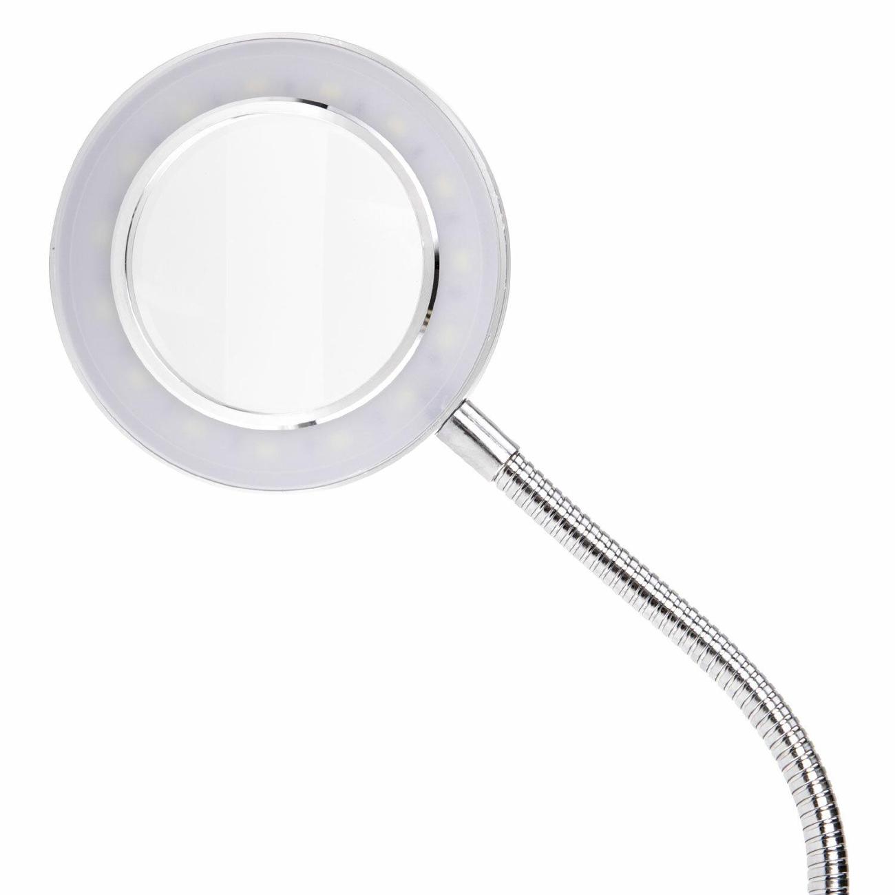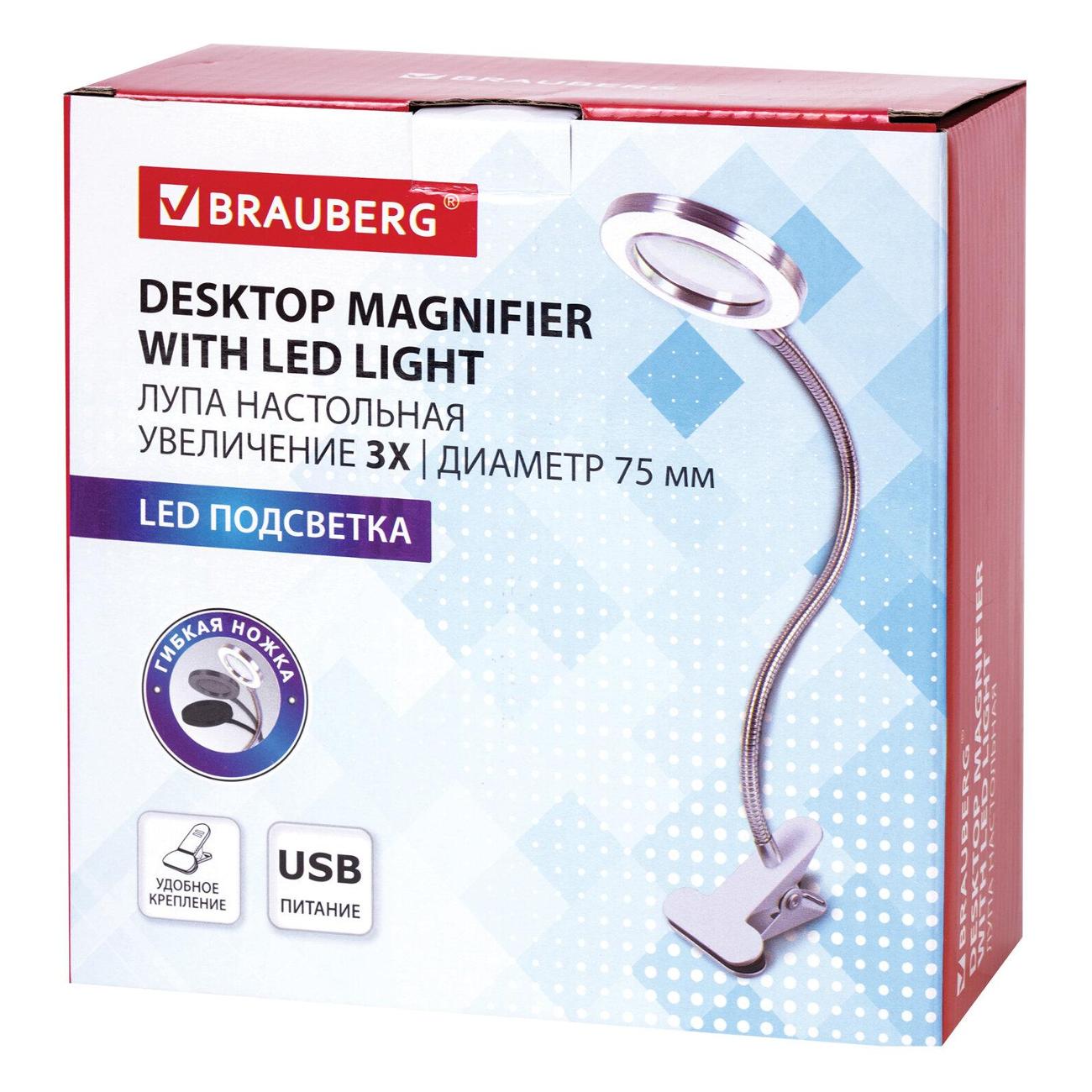 Корпус изделия изготовлен из металла. Крепится к поверхности при помощи прищепки. Гибкая ножка, несколько углов вращения. Регулируемый угол наклона. Увеличение линзы 3х, диаметр 75 мм. Светодиодная подсветка расположена по всему диаметру линзы. Подключается устройство к источнику питания при помощи USB-кабеля. Длина кабеля питания - 2 м. Длина гибкой ножки - 38 см, максимальная ширина захвата крепежной прищепки - 11 см, диаметр линзы с оправой - 11 см.