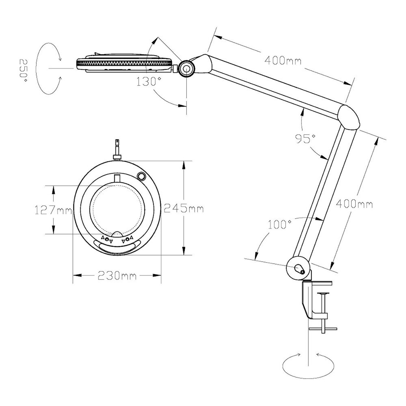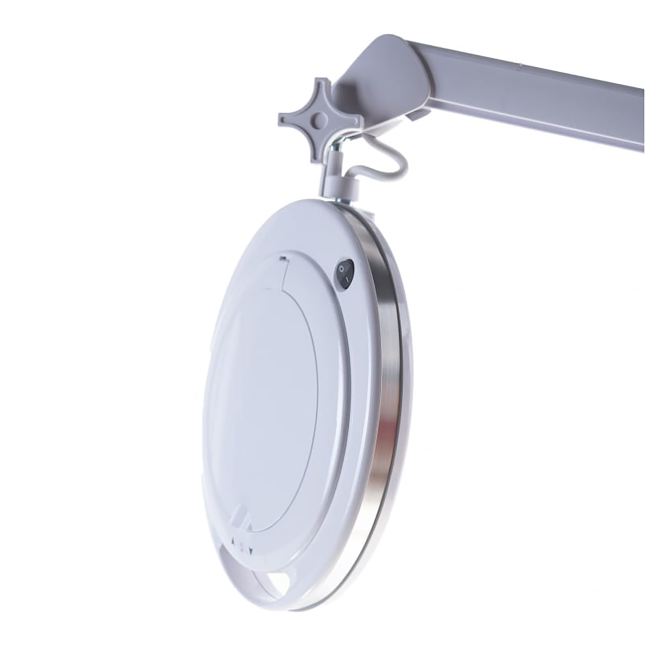 Линза выполнена из качественного стекла и обеспечивает чёткое изображение с минимумом искажений. Специальный звеньевой механизм с рабочим радиусом 100 см позволяет изменять положение лупы в пространстве. Надёжное винтовое крепление фиксирует конструкцию на любой ровной горизонтальной поверхности. Благодаря LED-подсветке приспособлением удобно пользоваться даже в затемнённых помещениях.