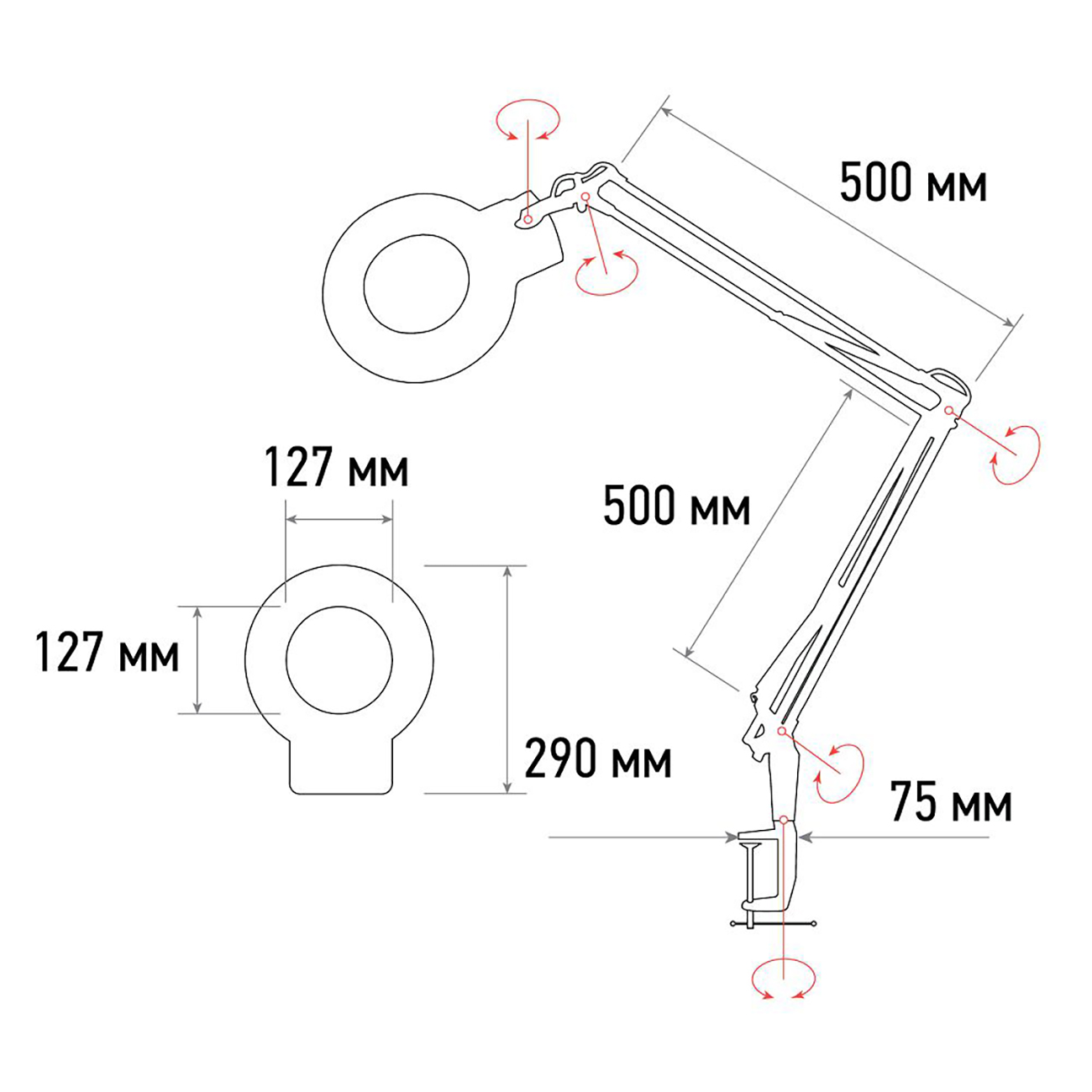 Линза выполнена из качественного стекла и обеспечивает чёткое изображение с минимумом искажений. Специальный звеньевой механизм с рабочим радиусом 100 см позволяет изменять положение лупы в пространстве. Надёжное винтовое крепление фиксирует конструкцию на любой ровной горизонтальной поверхности. Благодаря LED-подсветке приспособлением удобно пользоваться даже в затемнённых помещениях.