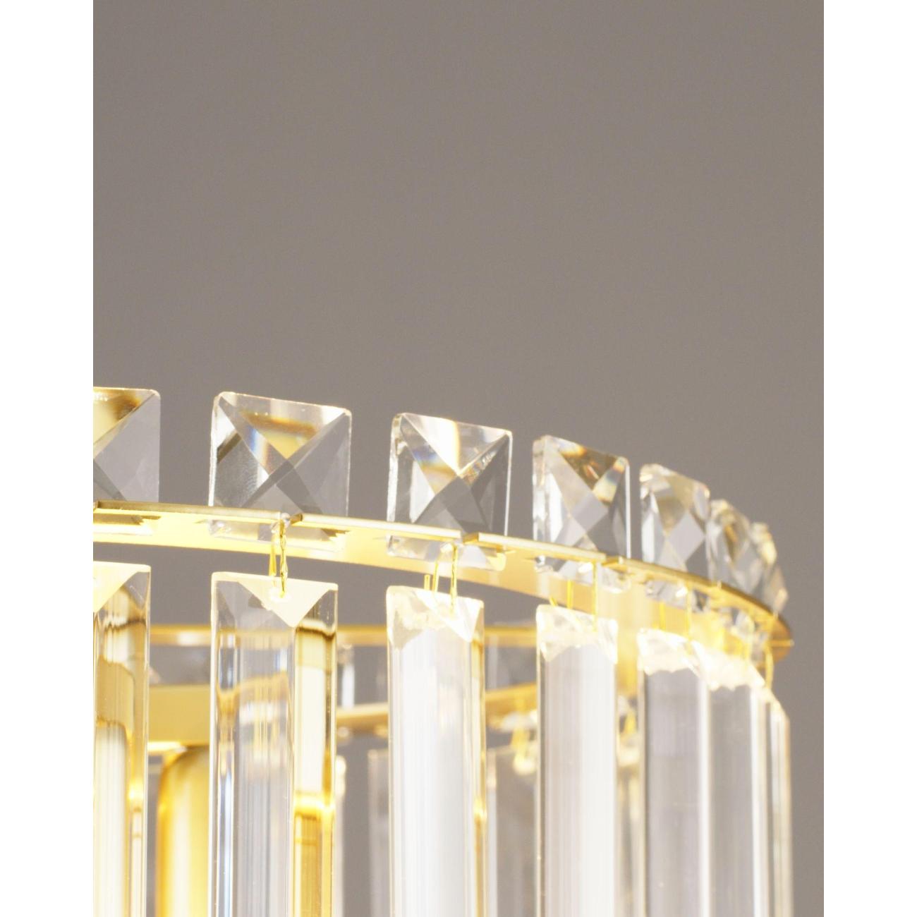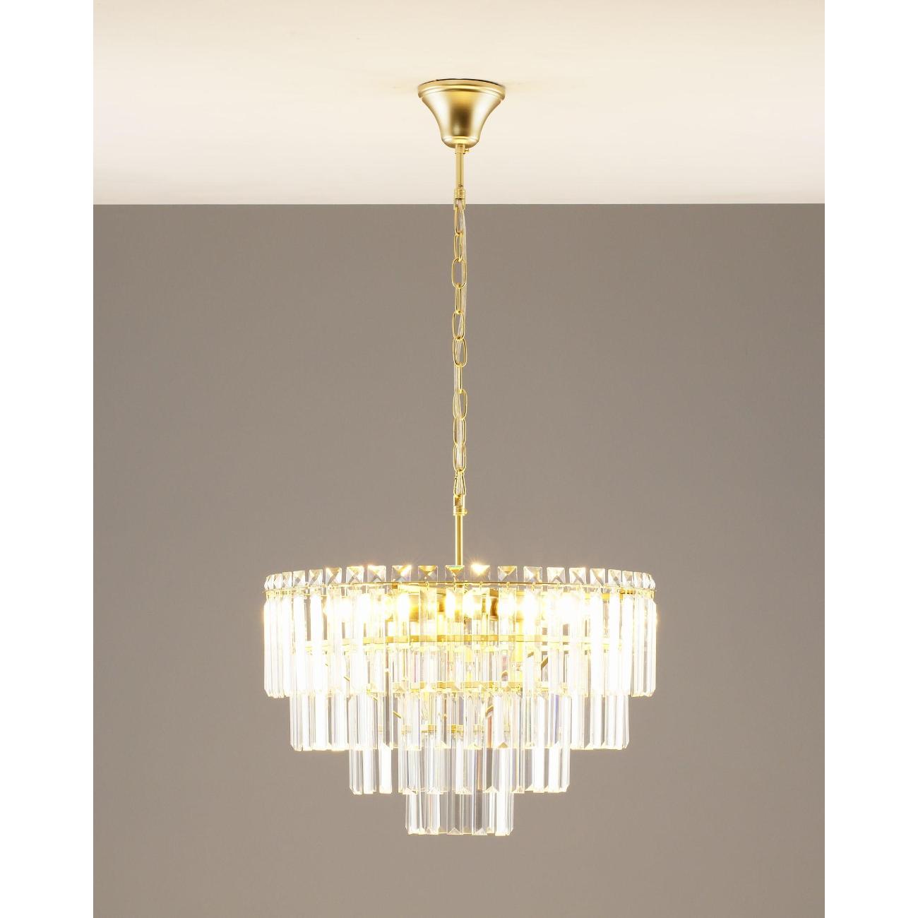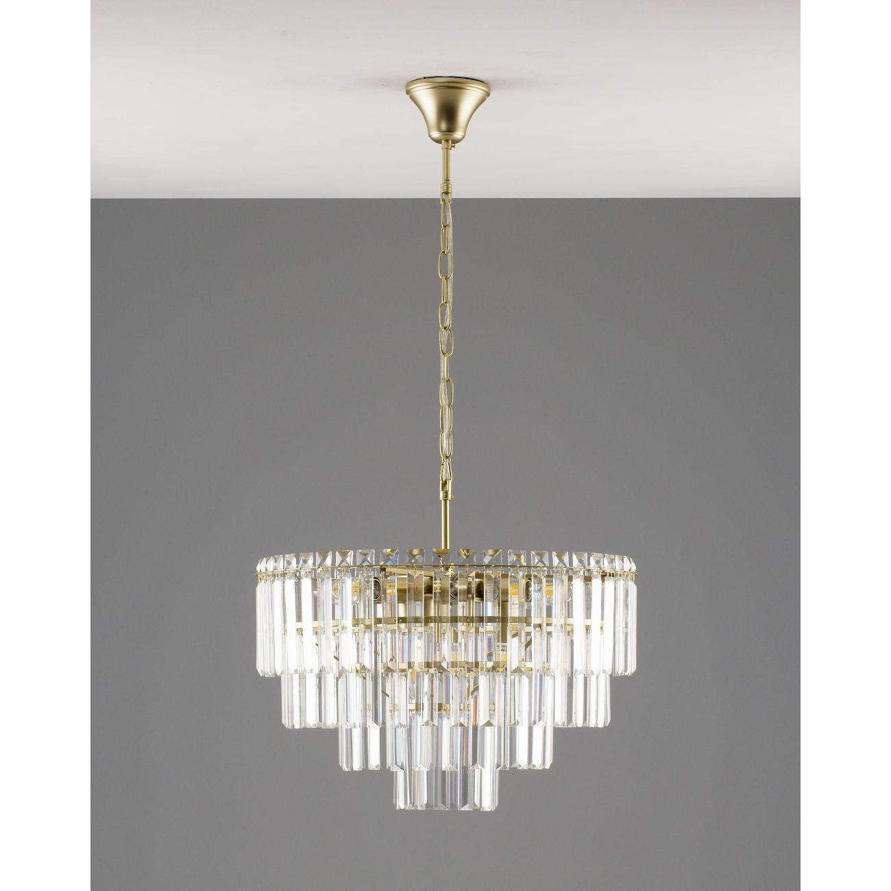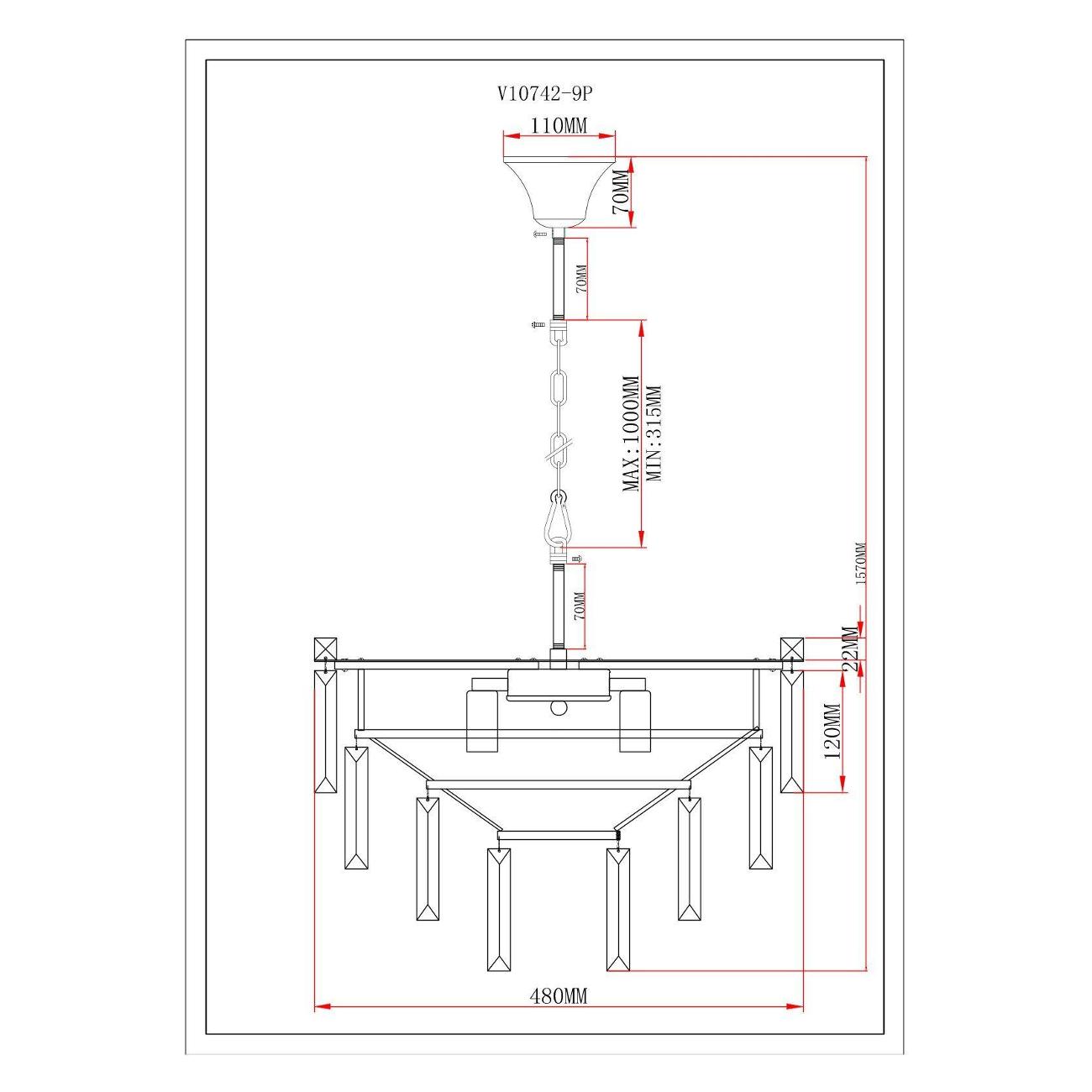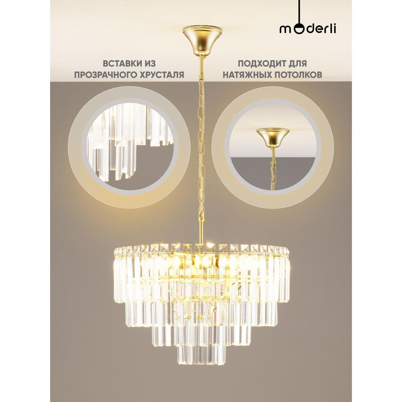 Подвесная люстра Crystal в современном стиле. Металлический каркас золотистого цвета дополнен вставками из прозрачного хрусталя, которые создают изумительную игру света при освещении. Стильный дизайн люстры дополнит любой современный интерьер, с площадью освещения 25 кв. м люстра станет идеальным выбором для больших комнат, а также для обеденной зоны или зала. В качестве источника света подойдут лампы с цоколем Е14 в количестве 9 штук. При необходимости высоту люстры можно отрегулировать с помощью подвесной цепи.