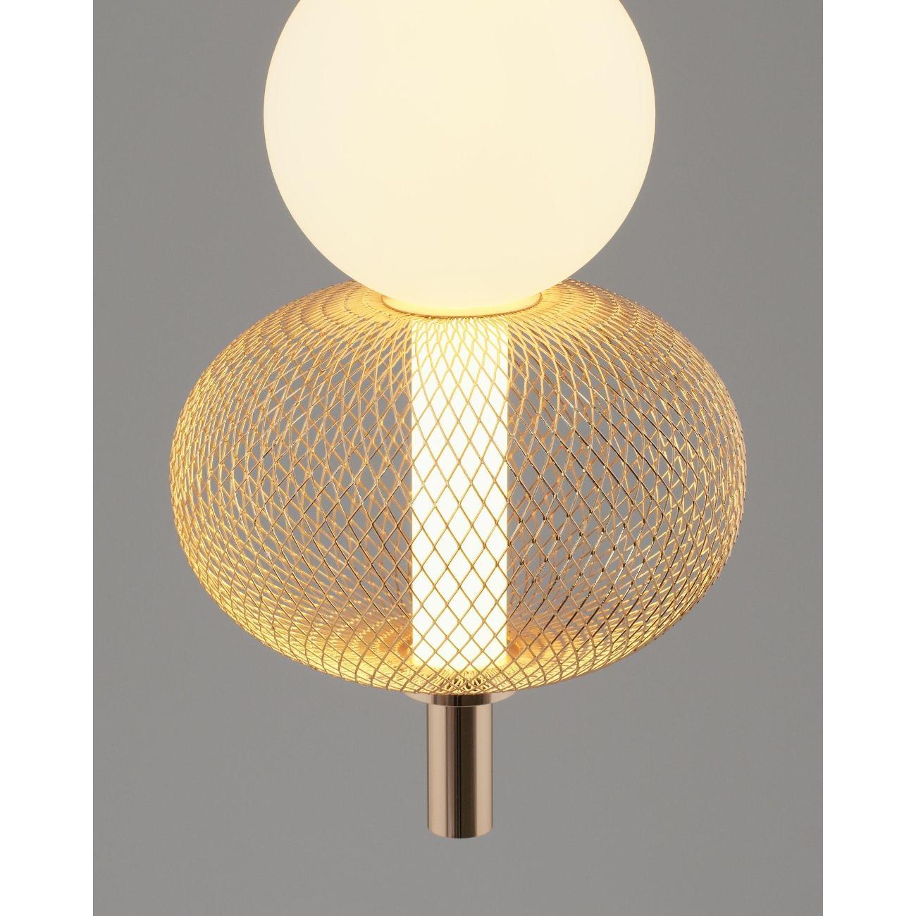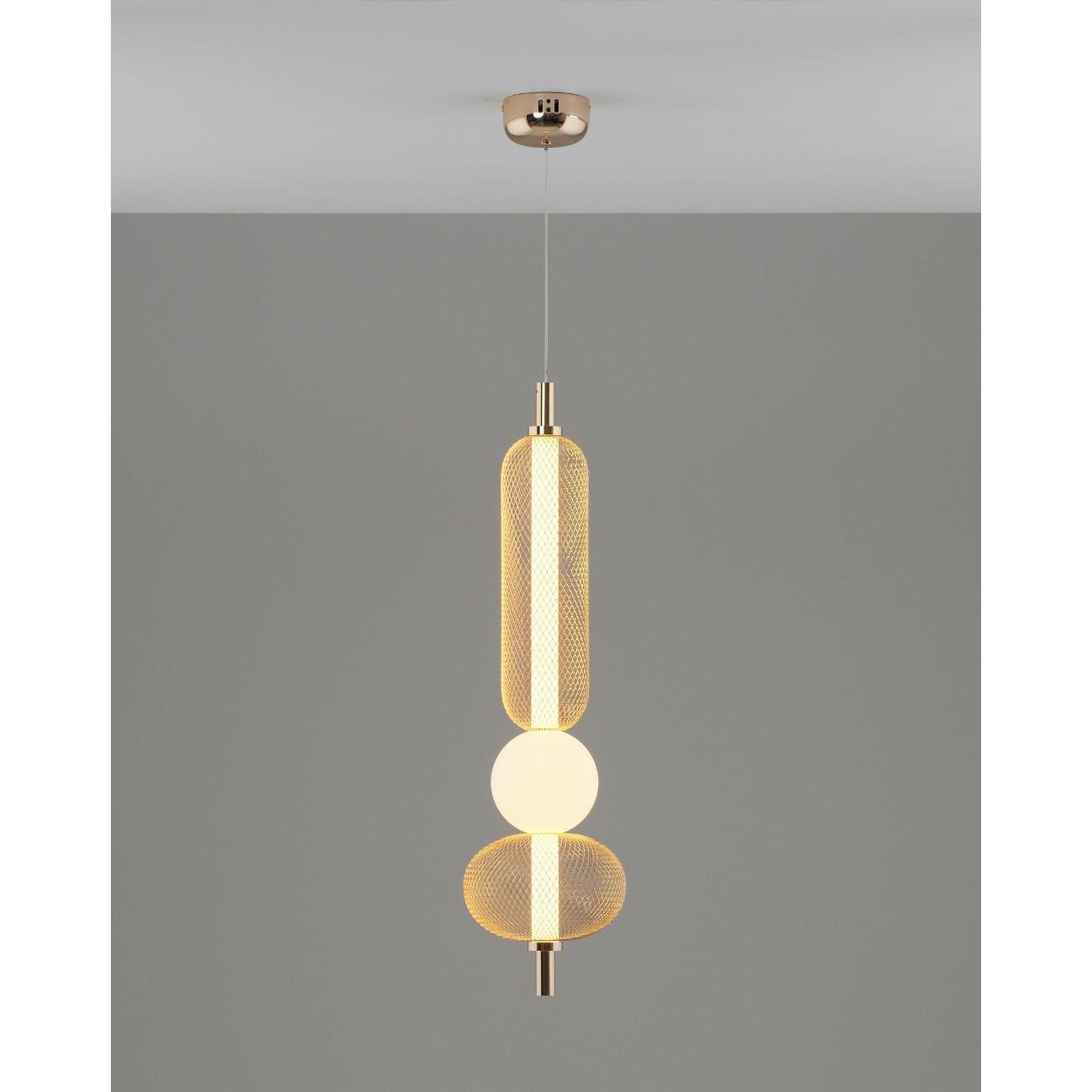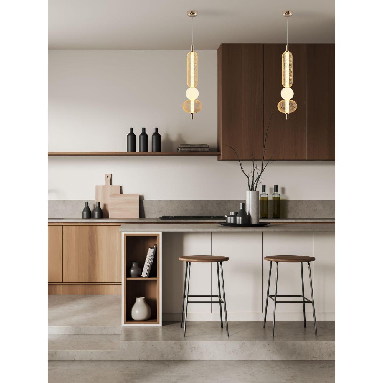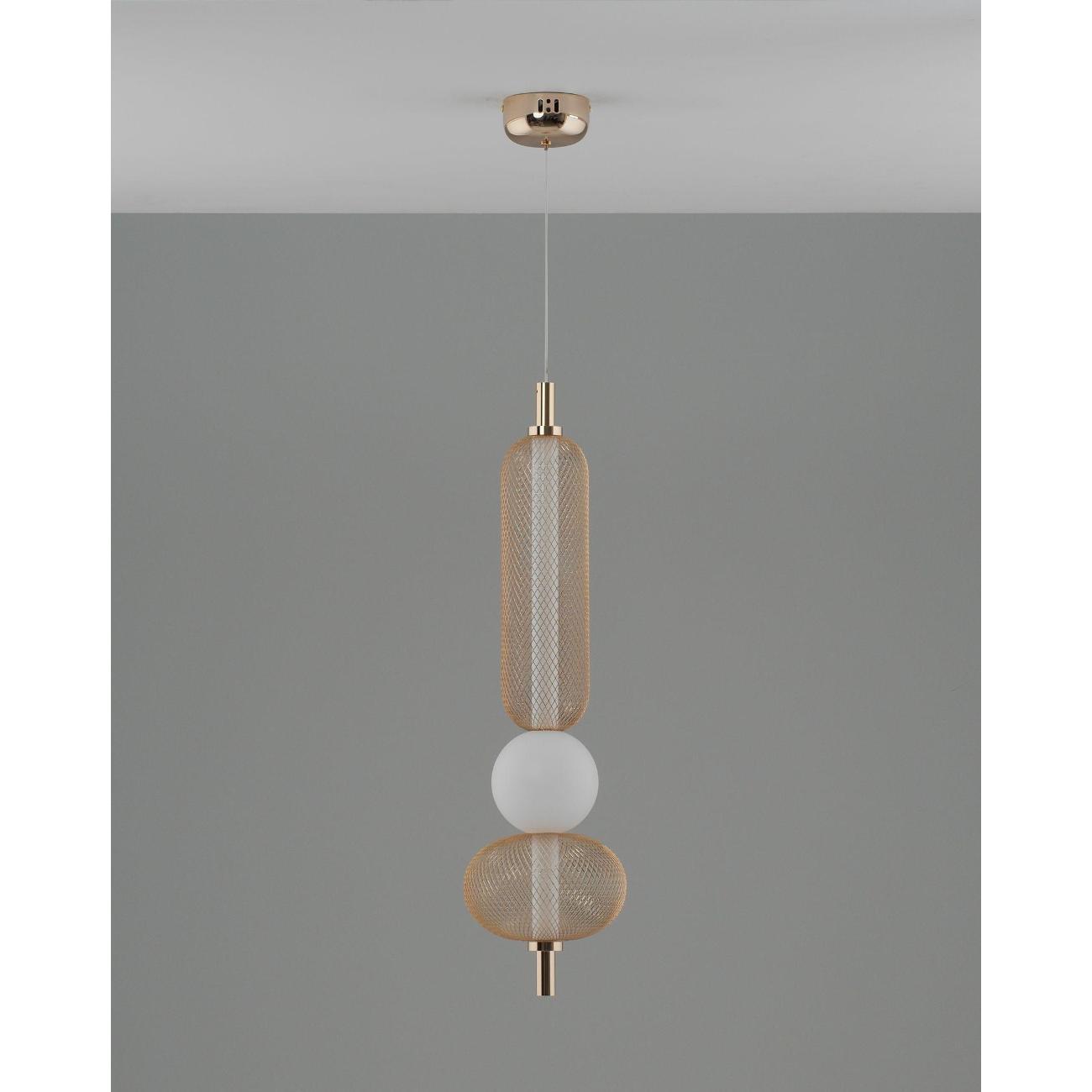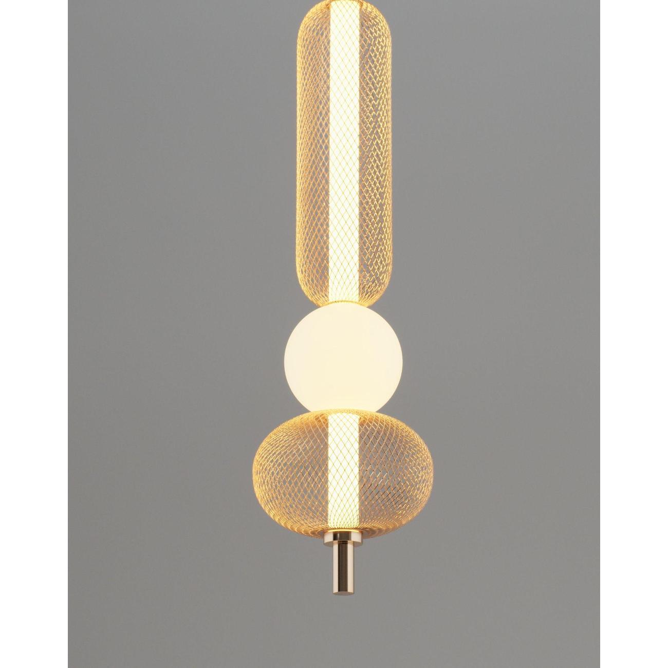 Современный стиль и изысканный дизайн. Светильник Lattice V11256-PL выполнен в стиле лофт и состоит из золотистого металлического корпуса с глянцевым покрытием, который гармонично сочетается с белым акриловым плафоном. Сетчатая конструкция корпуса придает светильнику индустриальный вид, а белый плафон создает мягкий и теплый свет, идеально подходящий для уютных интерьеров. Золотая арматура и подвесной шнур подчеркивают современность и функциональность дизайна.