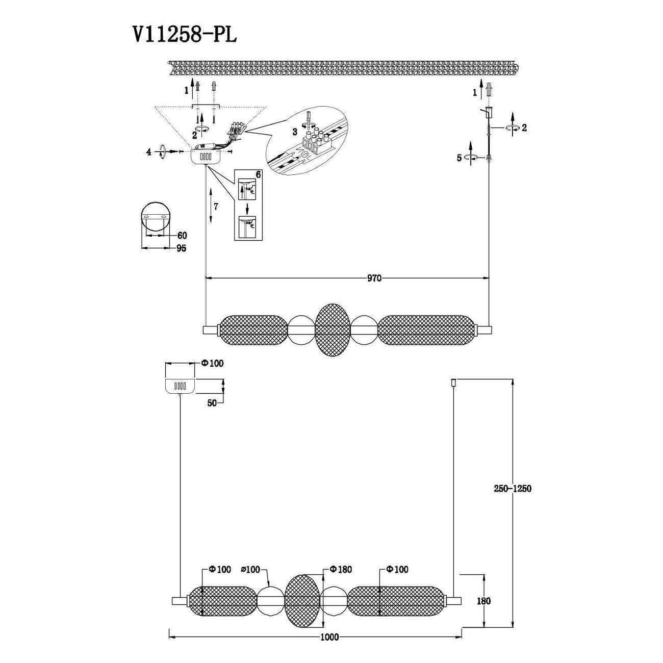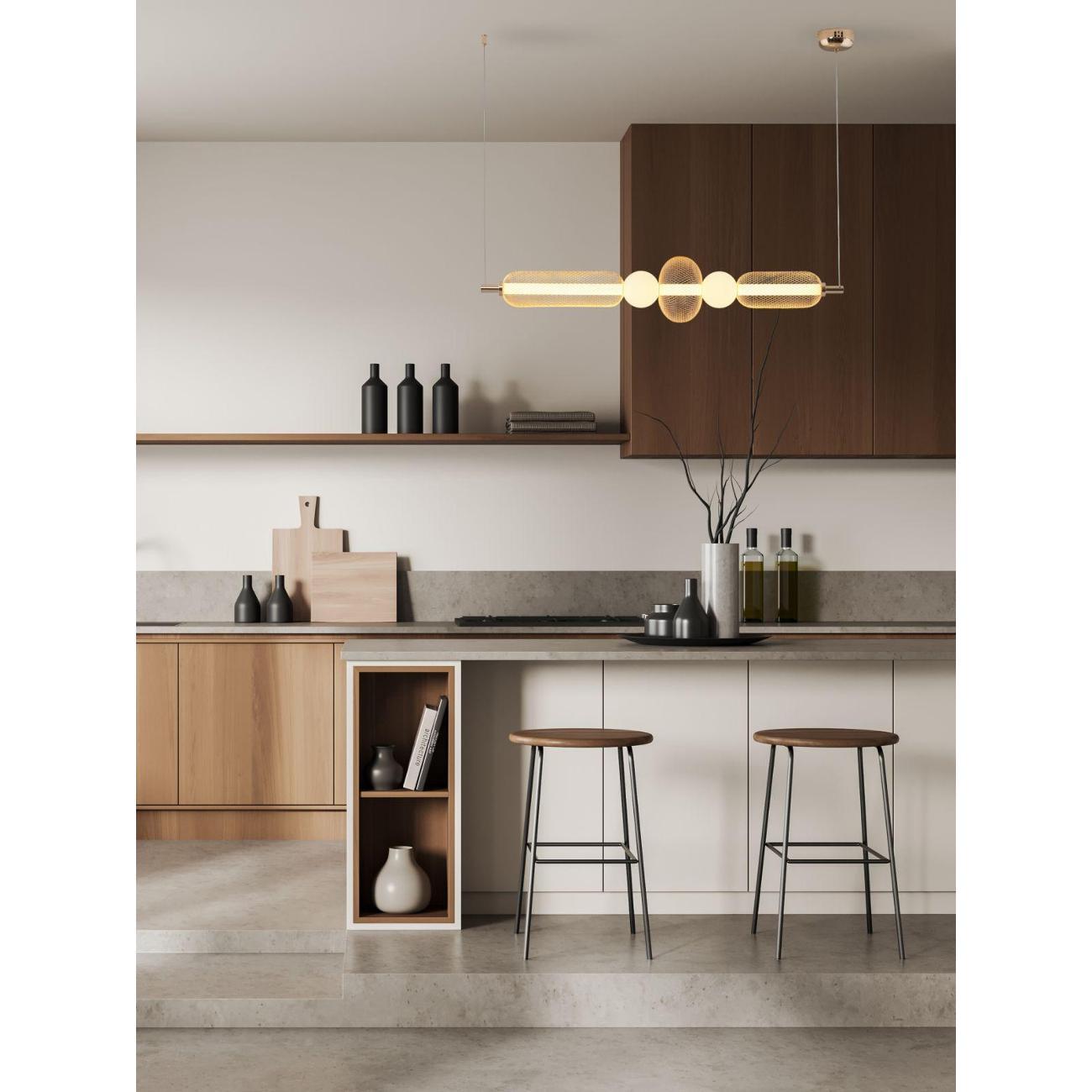 Преимущества материалов. Корпус выполнен из металла, пластика и акрила, что обеспечивает долговечность и лёгкость конструкции. Контраст между корпусом и стеклянными плафонами создают стильный акцент. Светильник легко настраивается по высоте, что делает его универсальным для различных типов помещений.